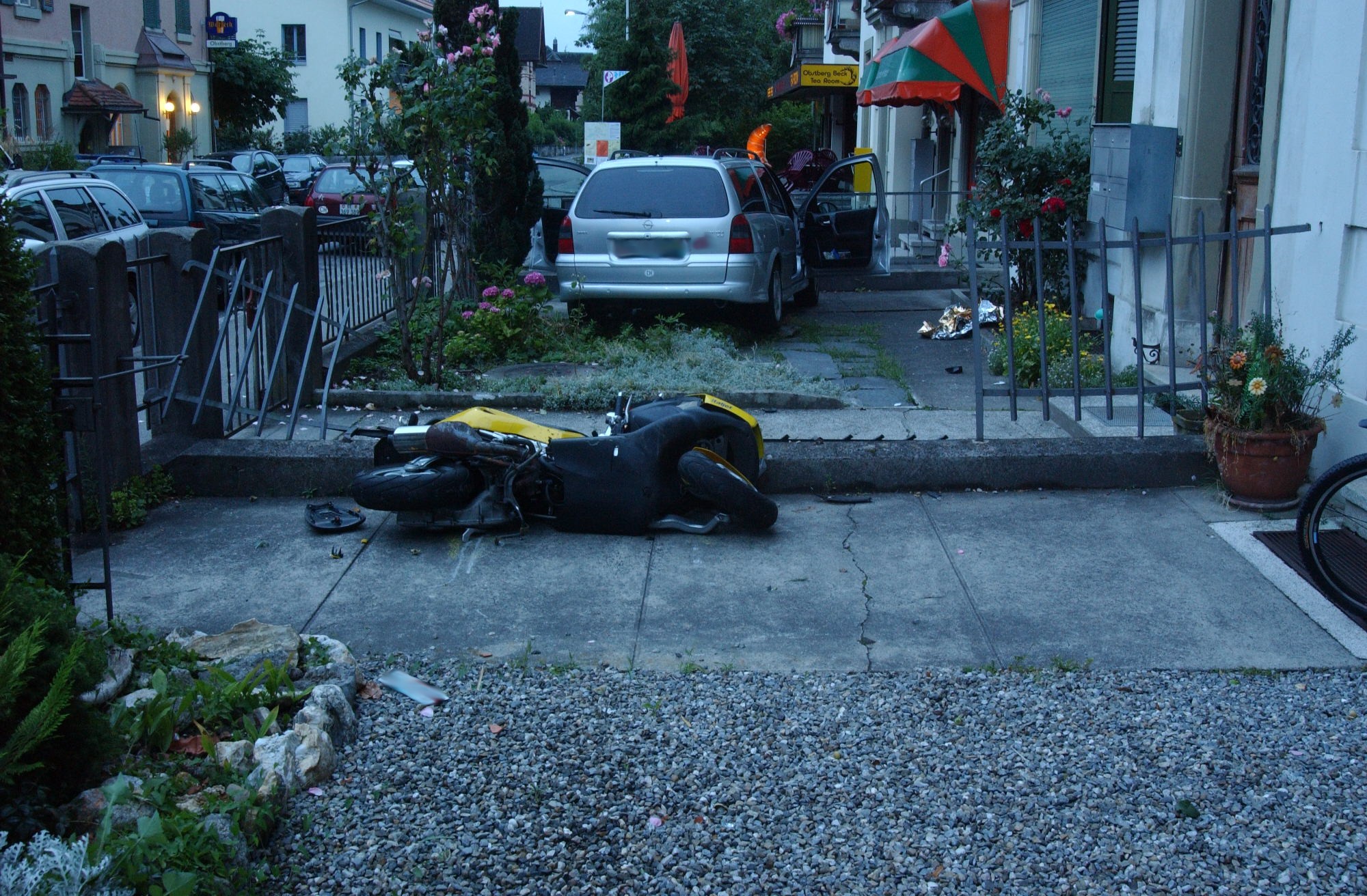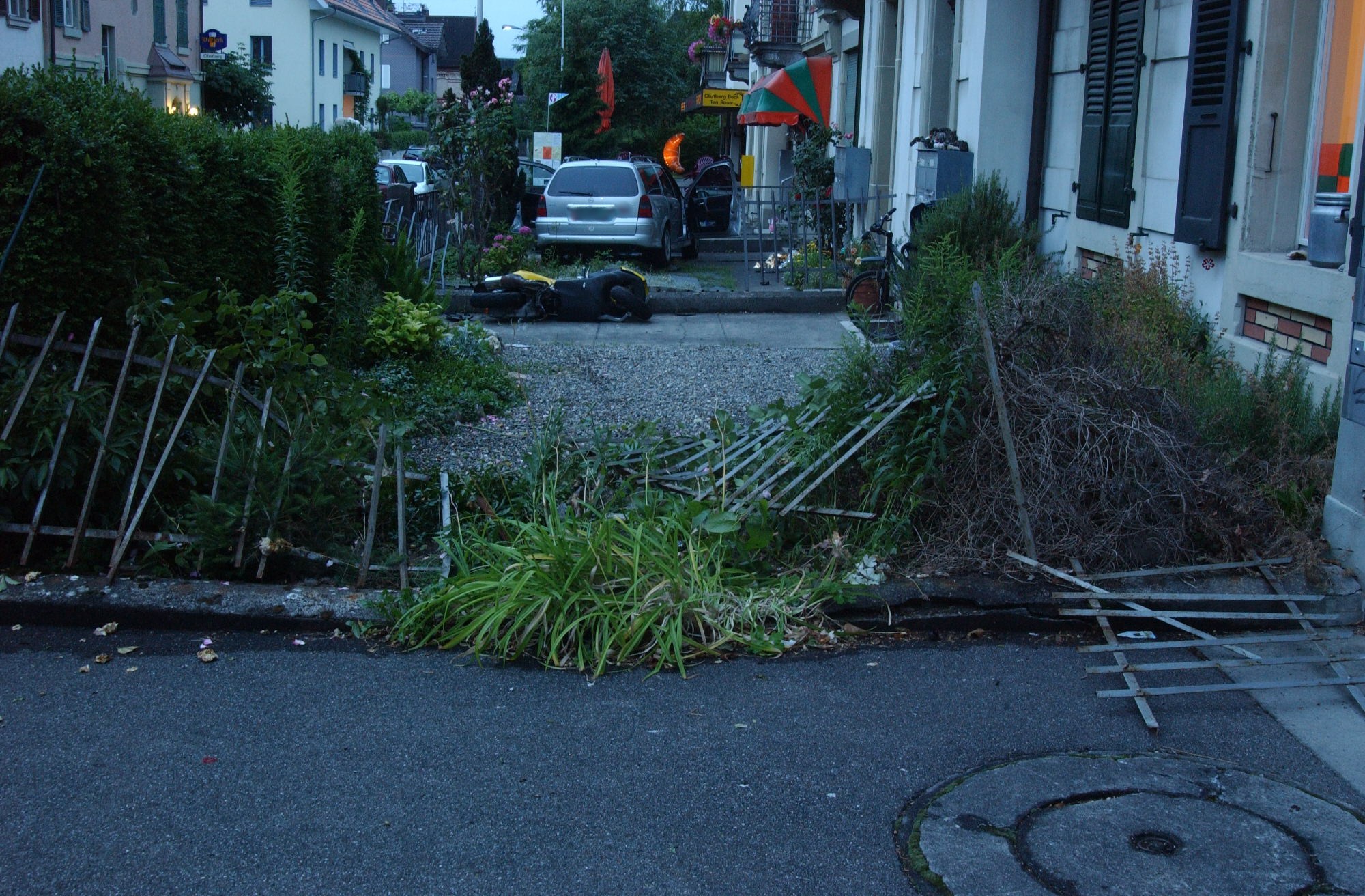 Das Auto machte sich selbstständig, geriet nach dem Überqueren des Steigerweges nach rechts, passierte diagonal das Trottoir und prallte auf dem Vorplatz der dortigen Liegenschaft in zwei Blumenkisten. Anschliessend überfuhr das Auto ein vor der nächsten Liegenschaft stehenden Motorroller, bevor es über eine kleine Treppe hinunter zum Wattenwylweg rollte.