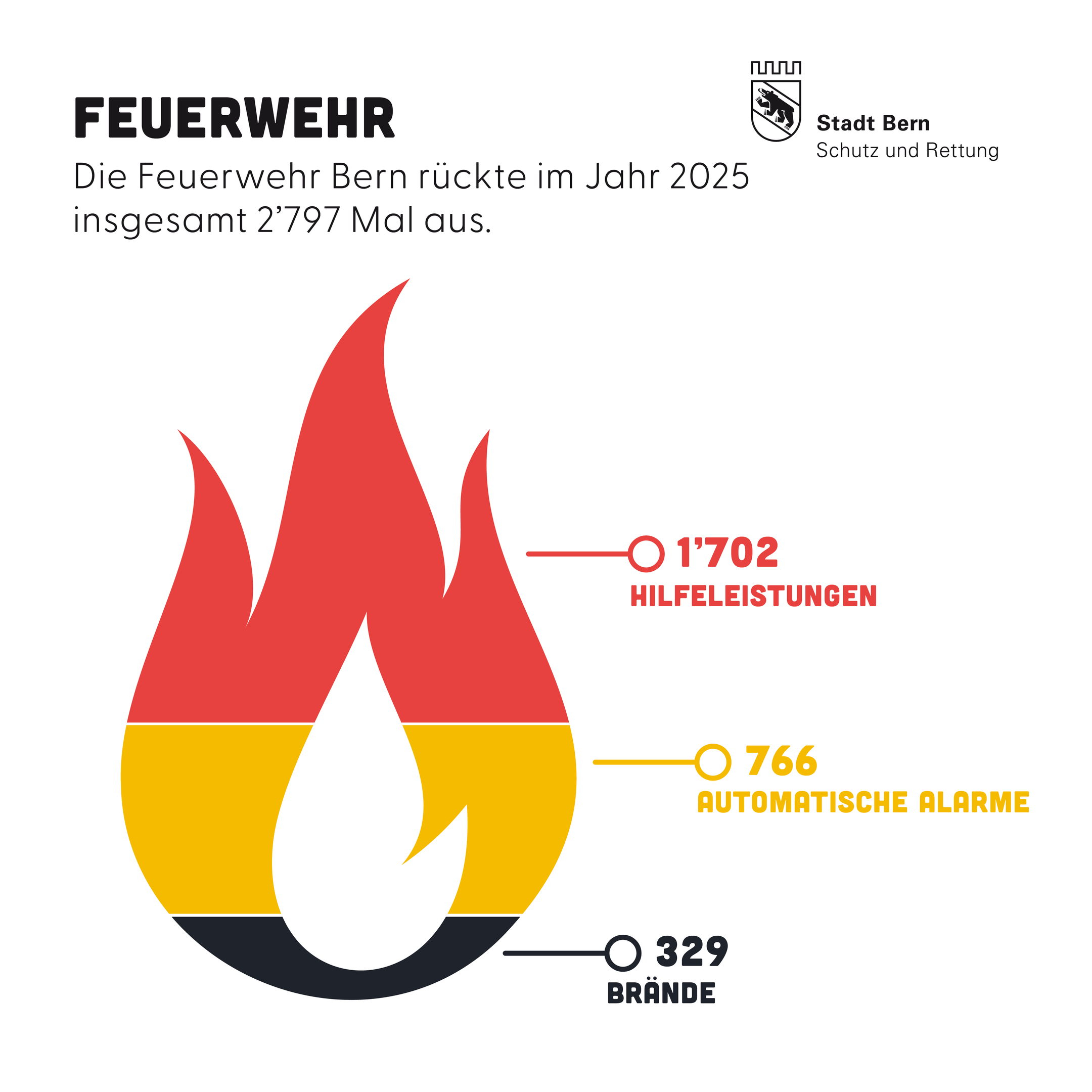 Von den insgesamt 329 (2024: 319) Brandfällen betrafen 246 (2024: 170) das Gemeindegebiet Bern. Bei 83 (2024: 149) Bränden auf dem Kantonsgebiet kam die Berufsfeuerwehr zur Verstärkung der jeweiligen Ortsfeuerwehr zum Einsatz. In 766 (2024: 837) Fällen rückte die Feuerwehr aufgrund automatischer Alarmmeldungen aus.