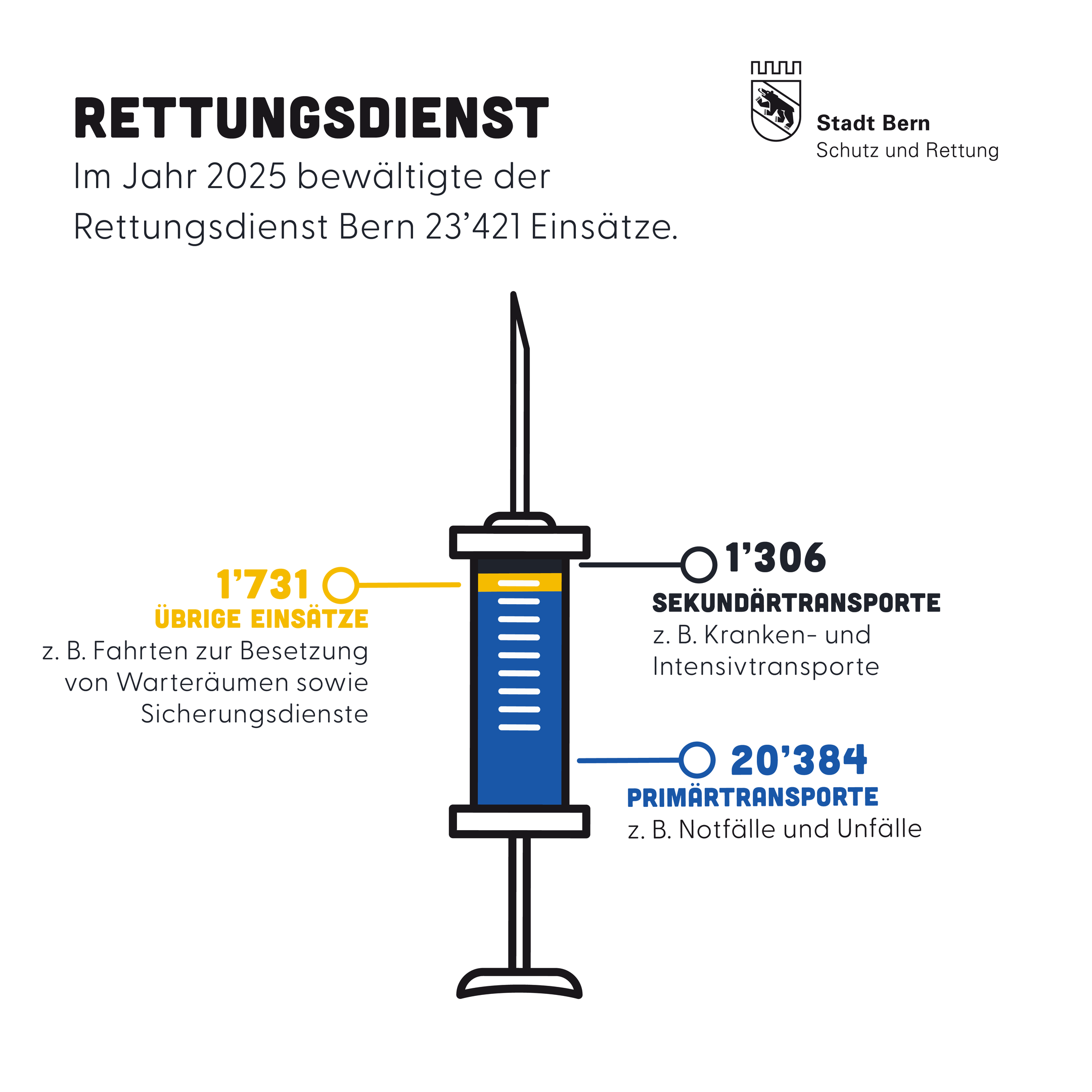 Der Rettungsdienst Bern rückte im Jahr 2025 zu insgesamt 23'421 (2024: 21'764) Einsätzen aus. Das entspricht durchschnittlich rund 64 (2024: 60) Einsätzen pro Tag. Die Einsätze umfassten Primär- und Sekundäreinsätze sowie übrige Einsätze. Die Einsatzfahrzeuge legten dabei insgesamt 475'833 (2024: 466'794) Kilometer zurück.
