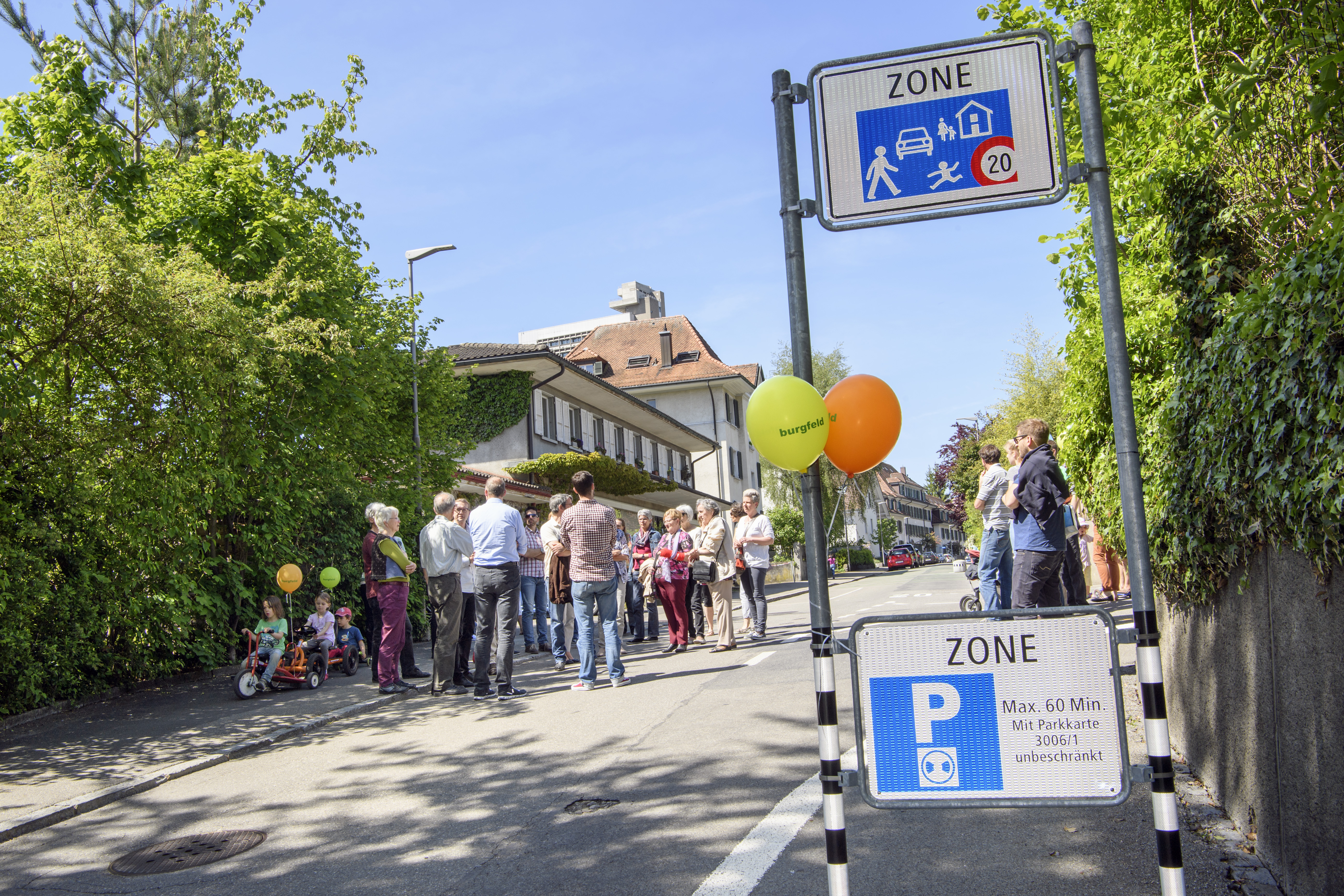 Mit einem gemeinsamen Fest feierten der Verein Burgfeld Treff und der Quartierverein Burgfeld heute die Eröffnung der ersten grossflächigen Begegnungszone in einem Wohnquartier der Schweiz. Die bestehende Begegnungszone an der Spelterinistrasse wurde auf das ganze Quartier ausgedehnt. Gemeinderätin Ursula Wyss und Verkehrsplaner Karl Vogel waren zum Eröffnungsanlass eingeladen. Ursula Wyss hielt eine kurze Ansprache, Karl Vogel führte Interessierte auf einem Rundgang durchs Quartier.