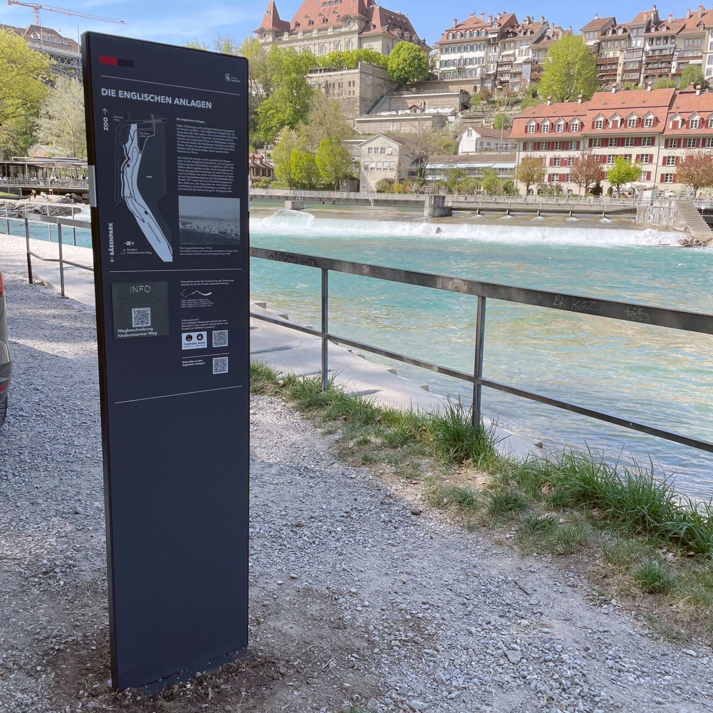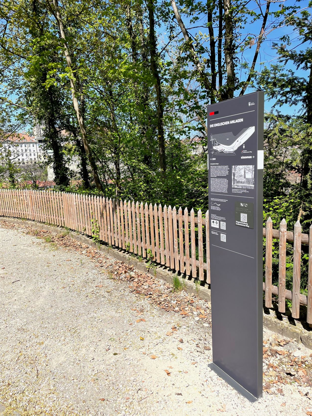 Neu ist der Weg auf drei Stelen vor Ort signalisiert. Ein QR-Code mit taktiler Markierung auf den Stelen führt zu einer Webbeschreibung auf www.bern.ch/englischeanlagenhindernisarm. Diese Beschreibung wurde speziell für Menschen mit Sehbehinderungen verfasst. Sie kann durch Sprachausgabe-Programme auf dem Smartphone vorgelesen werden und leitet so durch die Anlage. Dieses Angebot ist das erste dieser Art in einer Berner Grünanlage. Entsprechend gestaltet werden konnte der Weg im Rahmen der kürzlich erfolgten umfangreichen Sanierungsarbeiten. Alle Massnahmen von der Gestaltung bis zur Wegbeschreibung wurden in Zusammenarbeit mit den Betroffenen und dem Schweizerischen Blinden- und Sehbehindertenverband erarbeitet und getestet.