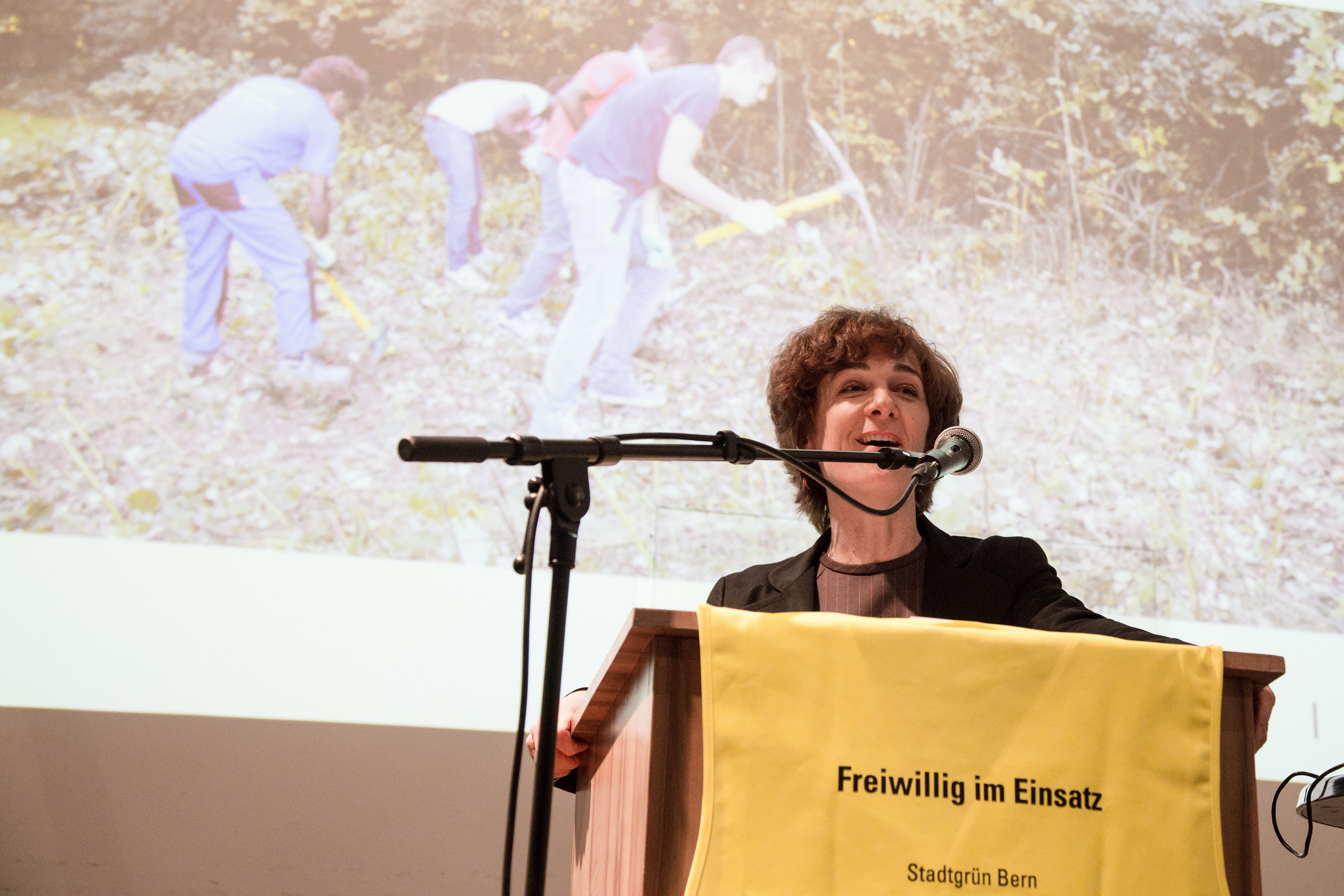 Bild 1 Gemeinderätin Ursula Wyss würdigt das grosse Engagement der 70 Freiwilligen für die Stadtnatur.