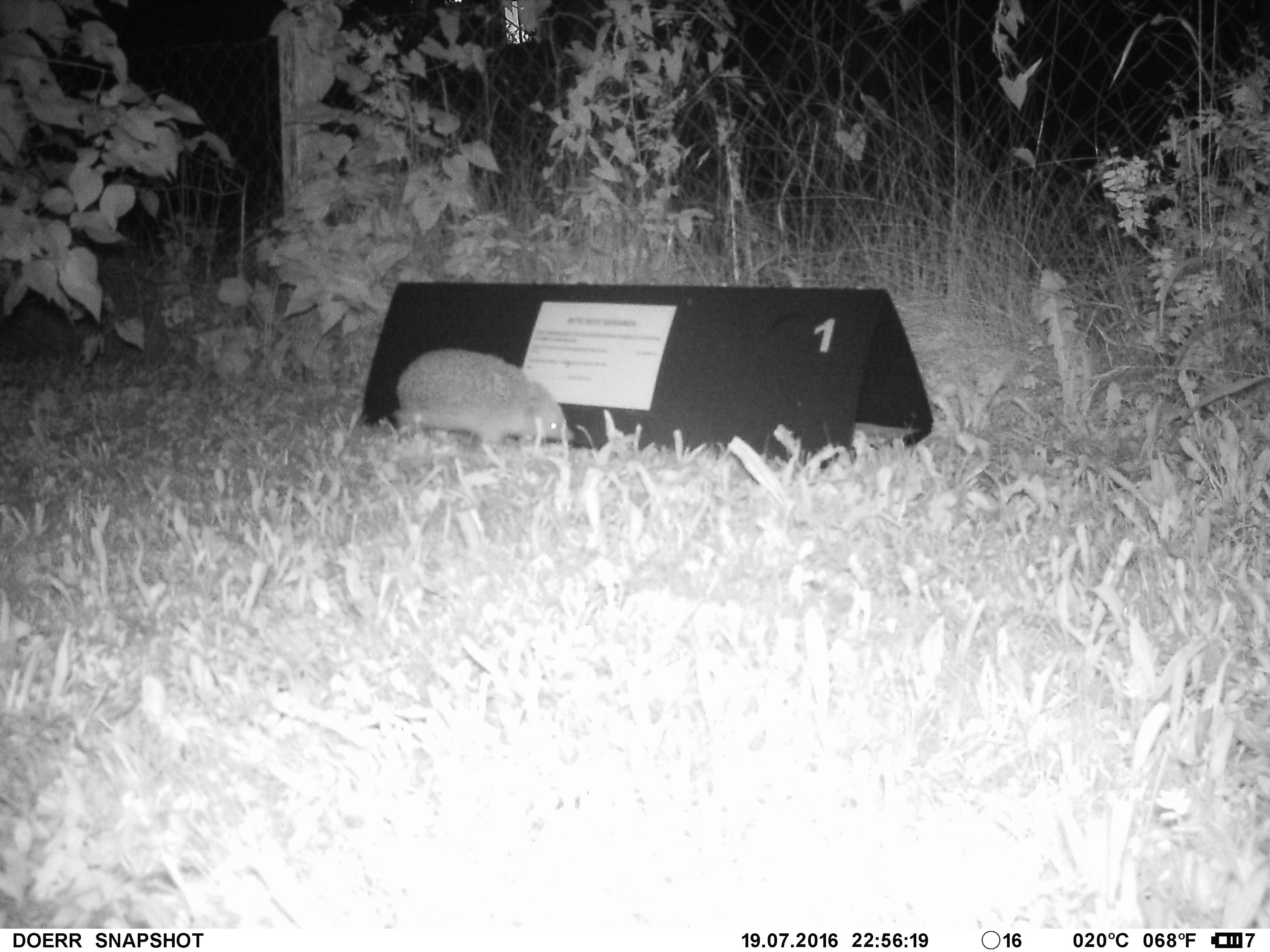 2 Spurentunnel mit Igel, Fotofallenbild. © Cornelia Hürzeler, stadtwildtiere.ch