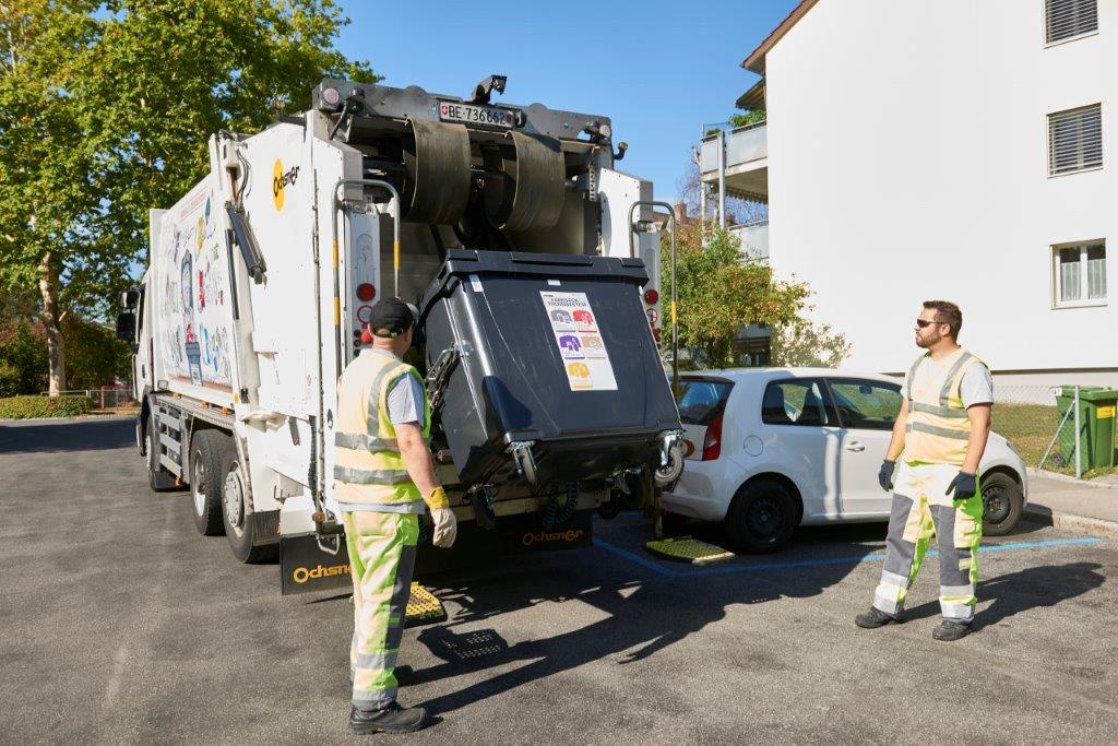 Ein ERB-Kehrichtfahrzeug leert einen Container | Bild: Nadine Strub
