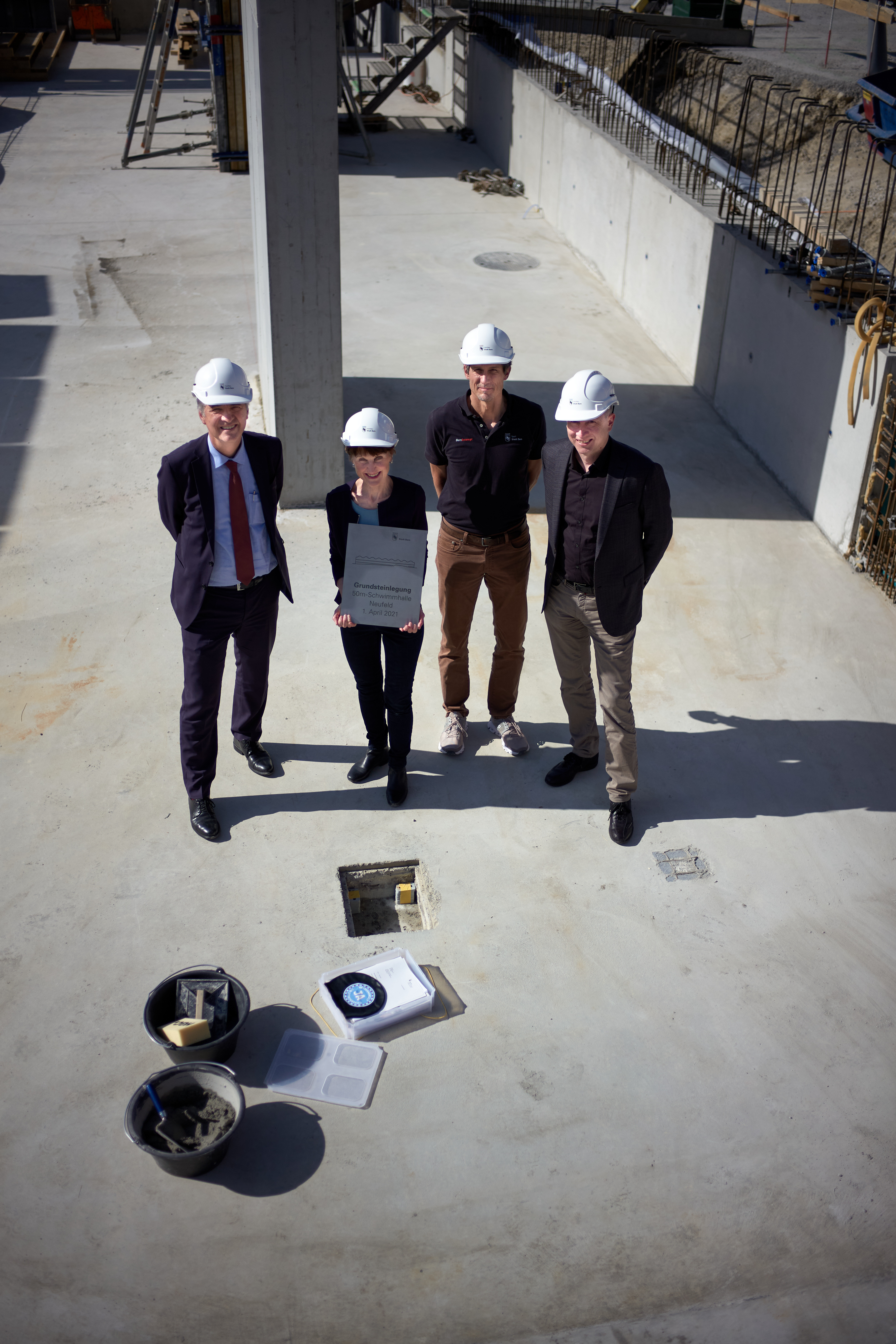 2 Grundsteinlegung Schwimmhalle Alec von Graffenried, Franziska Teuscher, Christian Bigler, Thomas Pfluger v.l. Bild Thomas Kaspar.jpg