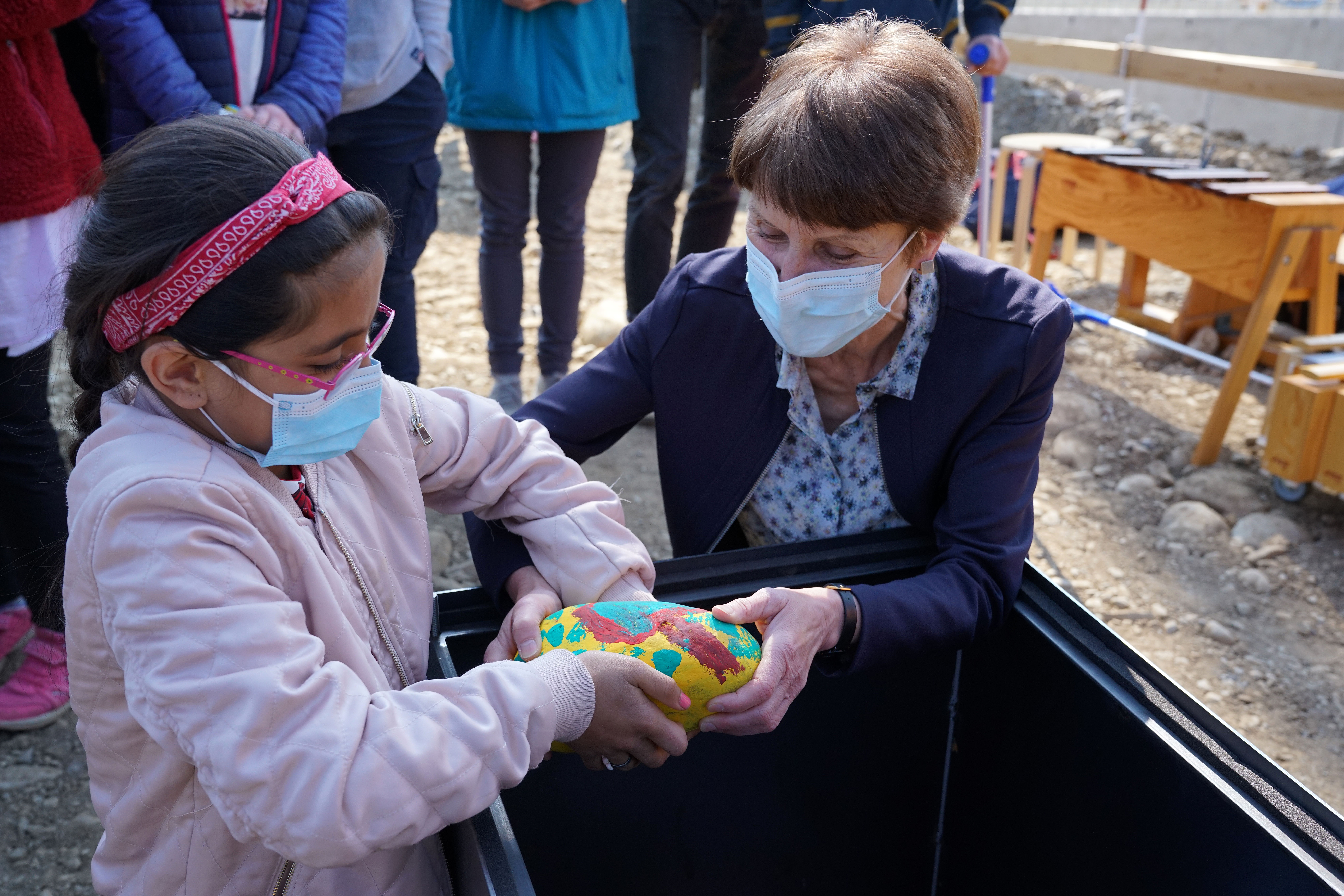 Gemeinderätin Franziska Teuscher hilft beim Füllen des Grundsteins (Bild Peter Brand).jpg