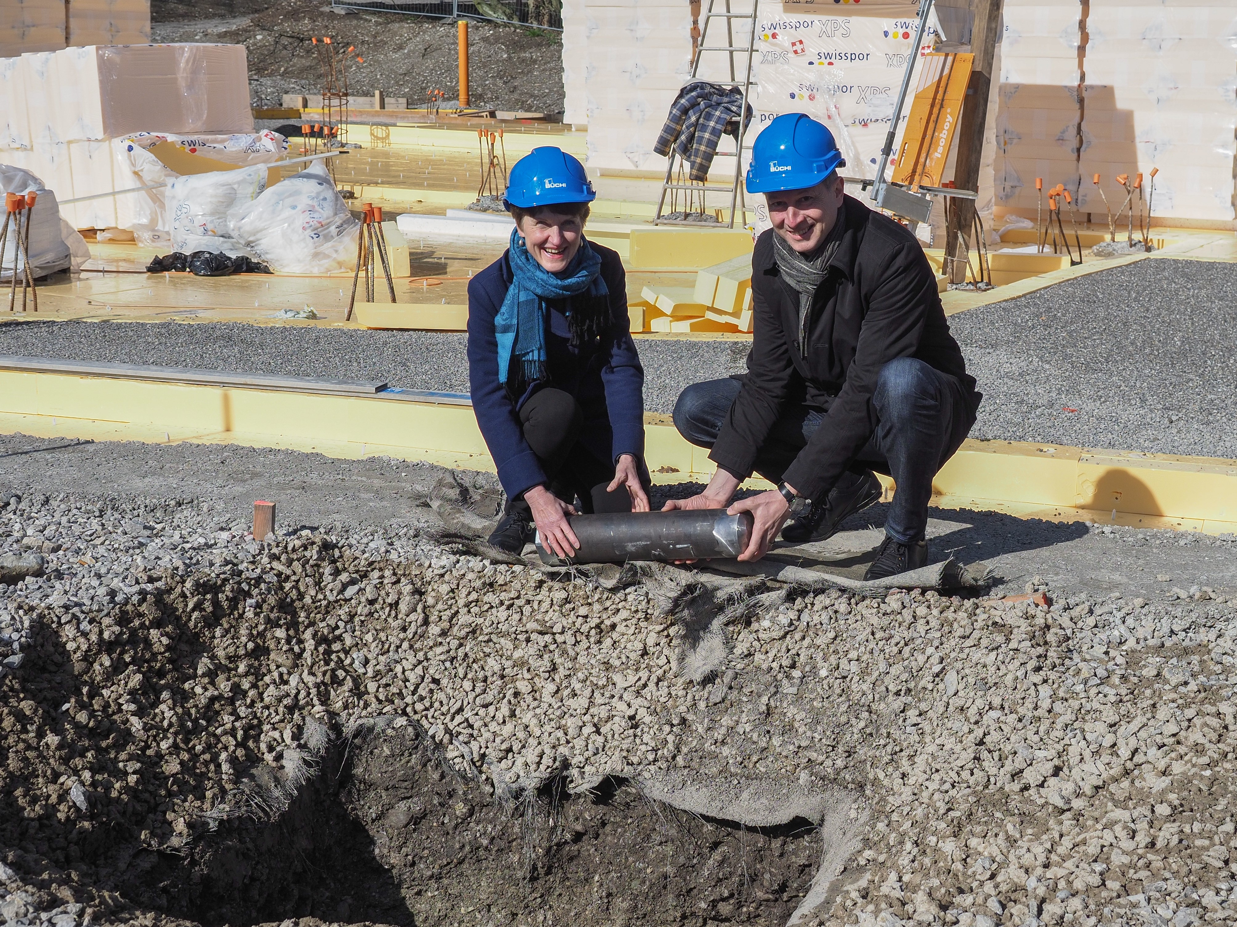 Gemeinderätin Franziska Teuscher und Stadtbaumeister Thomas Pfluger mit Zeitkapsel Bild Markus Hulliger.jpg