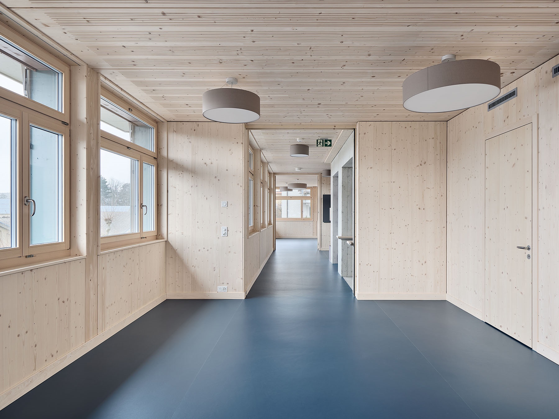 Jeder Kindergartenklasse steht jeweils ein grosser Hauptraum, einen Gruppenraum für vertieftes Lernen, eine Garderobe, ein Materialraum sowie eine Teeküche zur Verfügung. Die Räume der drei Kindergärten sind basisstufentauglich. Das Dachgeschoss wird vollständig durch die Tagesschule genutzt. In multifunktionalen Räumen kann dort während der Mittagszeit gegessen und in den übrigen Zeiten gelernt oder gespielt werden.