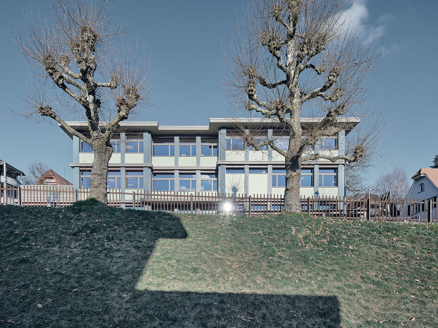 Durch die geschickte Anordnung im Grundriss erhält jede Gruppe im Erdgeschoss ihren direkten und separaten Zugang zum Aussenraum. Das Obergeschoss verfügt zudem über eine grosse Terrasse, um die verschiedenen Interessen von Kindergarten und Tagesschule auch im Aussenraum optimal trennen zu können. Die Umgebung bietet den Kindern der Kindergärten sowie der Tagesschule Bewegungs-, Rückzugs- sowie Naturerlebnisräume.