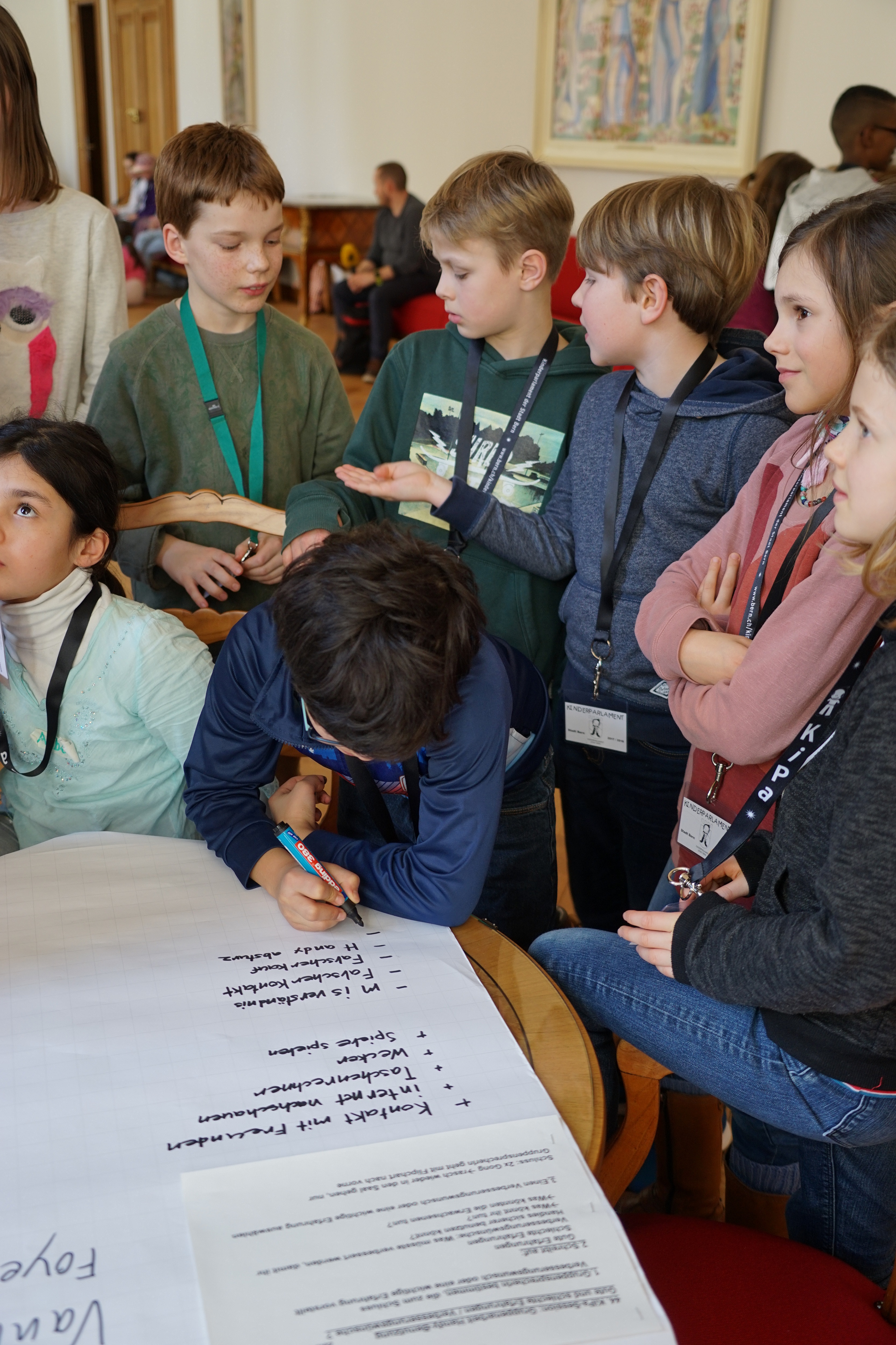 Anschliessend tauschten die Kinderparlamentarierinnen und Kinderparlamentarier gute und schlechte Erfahrungen bei der Handynutzung aus und diskutierten die Informationen der Fachstelle. Rasch wurden Tipps zum sicheren Chatten gesammelt. Es wurden auch Anliegen, wie das bessere Recycling von Handys oder das Recht auf ein Handy besprochen. Auch Möglichkeiten für einen besseren Umgang mit Handys wurden erörtert. Beispielsweise könnten Kinder und Eltern gemeinsam einen Medienvertrag abschliessen. Das verhindere grössere Auseinandersetzungen.