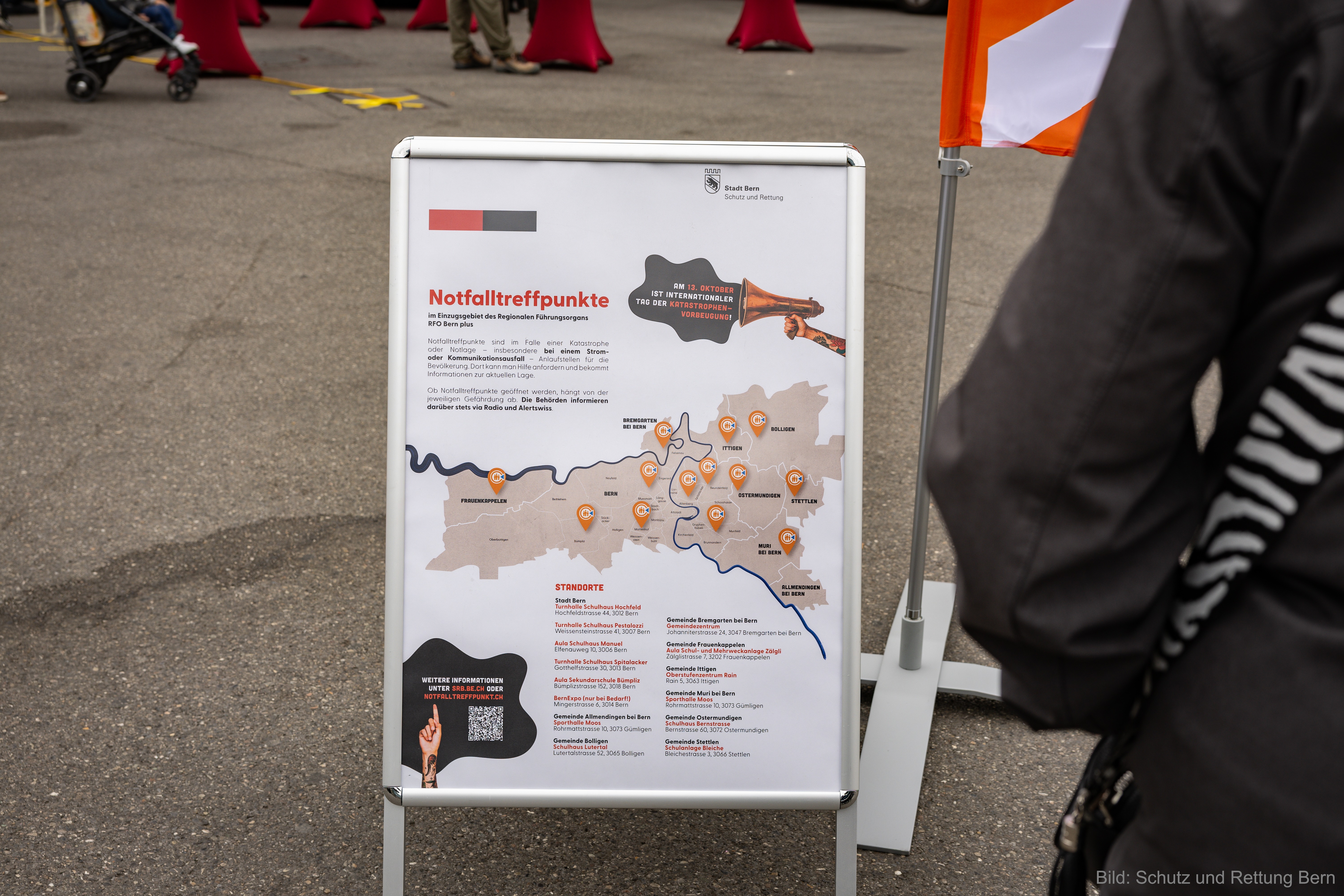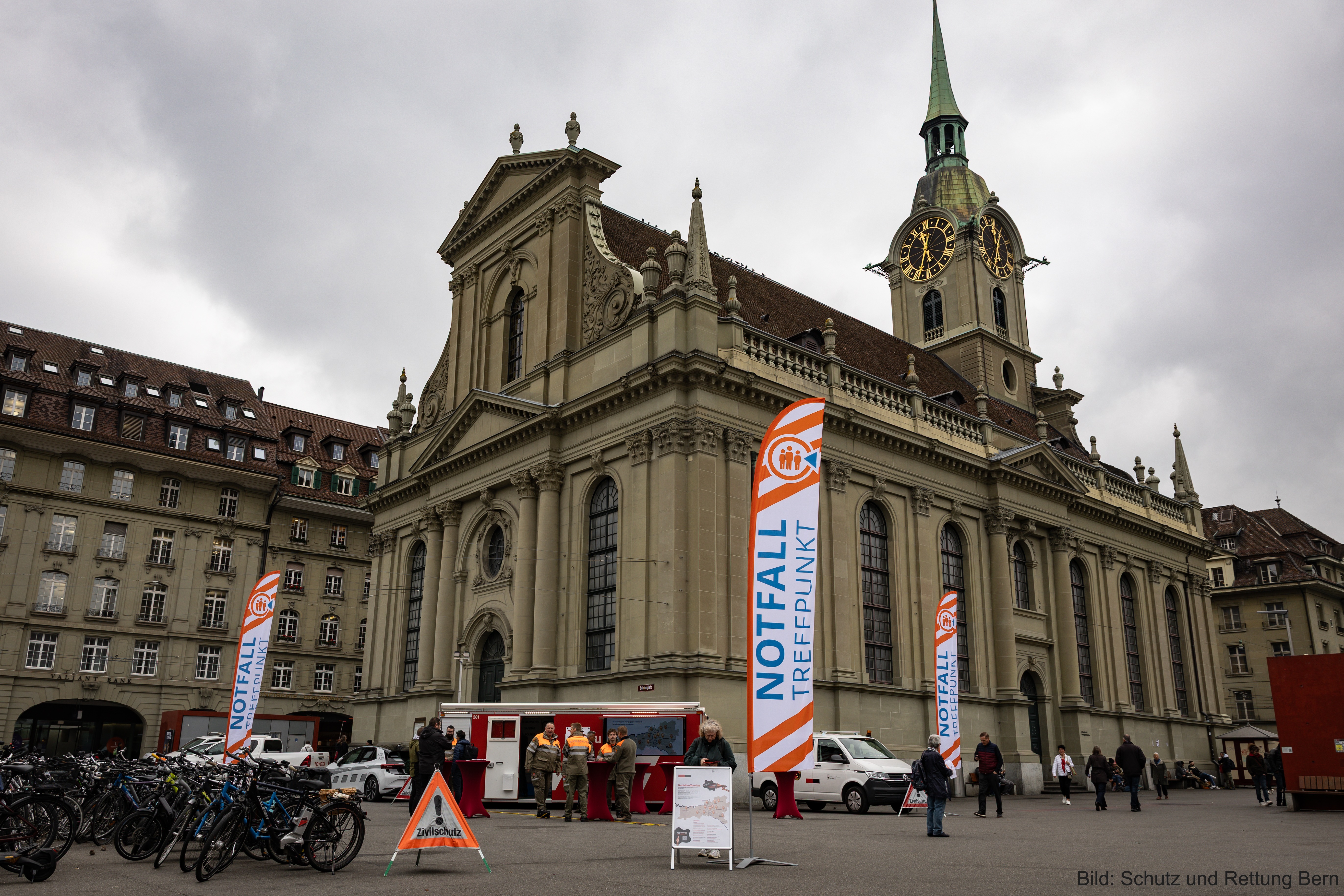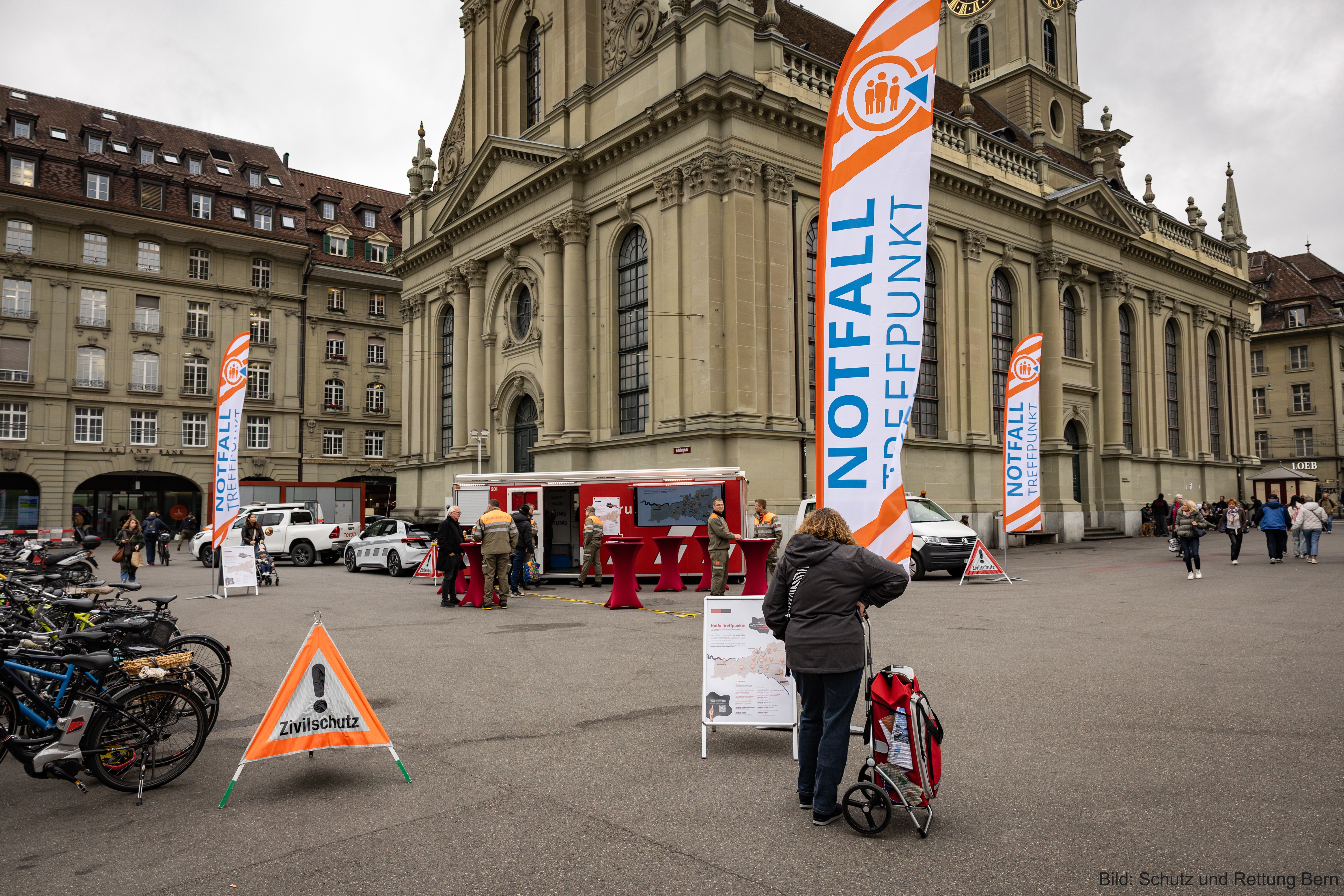 Notfalltreffpunkte sind Anlaufstelle für die Bevölkerung im Falle einer Krise, Katastrophe oder Notlage. Dort erhalten Menschen im Ereignisfall Informationen oder können Hilfe anfordern. Anlässlich des heutigen «Internationalen Tages der Katastrophenvorbeugung» wurde auf dem Bahnhofplatz in Bern ein mobiler Notfalltreffpunkt eingerichtet, um den jährlichen Funktionstest durchzuführen. Regierungsrat Philippe Müller und Gemeinderat Alec von Graffenried betonten in diesem Rahmen die Wichtigkeit der Notfalltreffpunkte für die Bevölkerung.