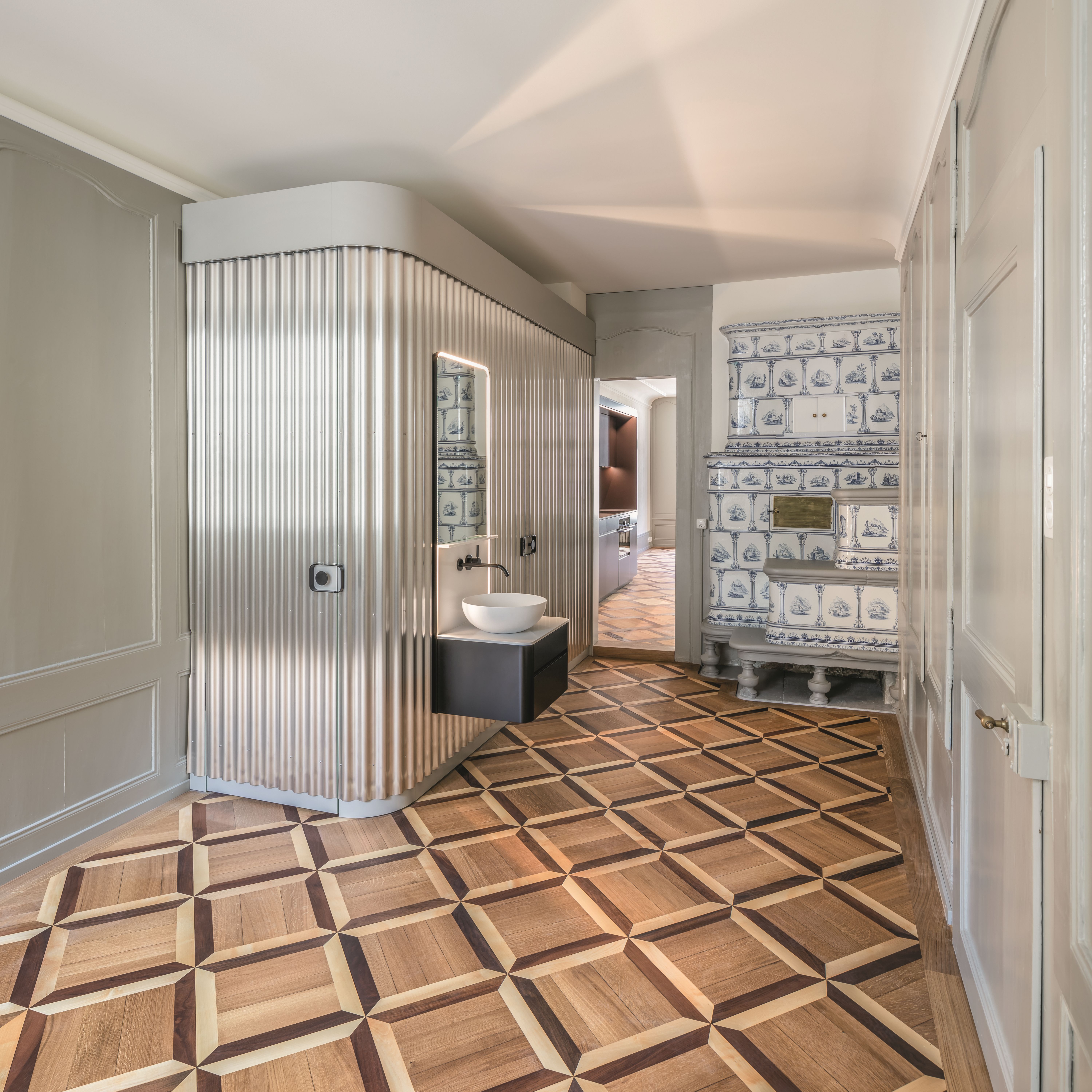 Kramgasse 59/Münstergasse 54 - Zimmer mit Badezimmerbox und Gnehm-Ofen 2. Obergeschoss (© Roland Trachsel Fotografie, 2021)