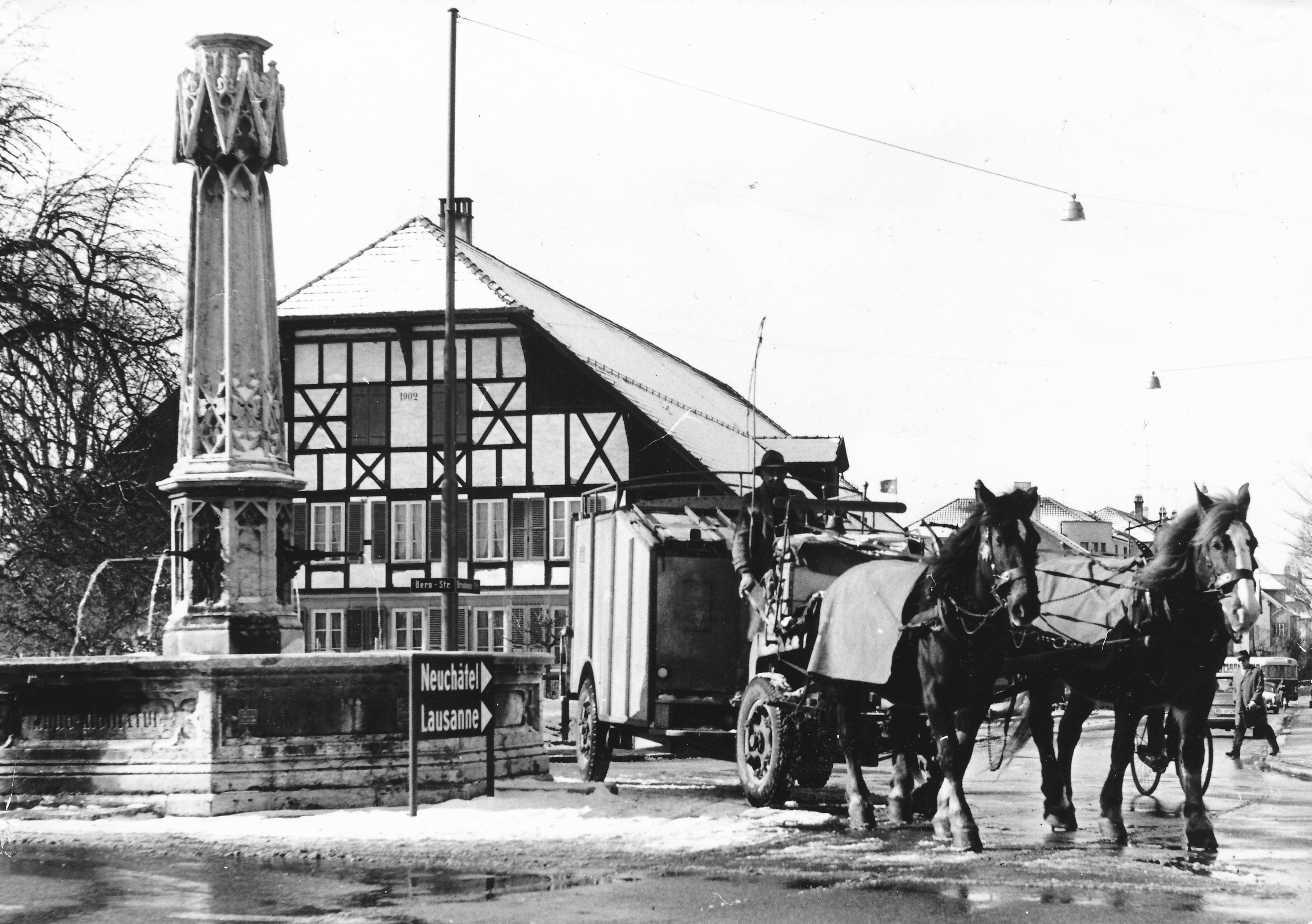Dorfbrunnen Kreisel Pferdeabfuhr 1966 Foto Ortsarchiv Bümpliz.jpg