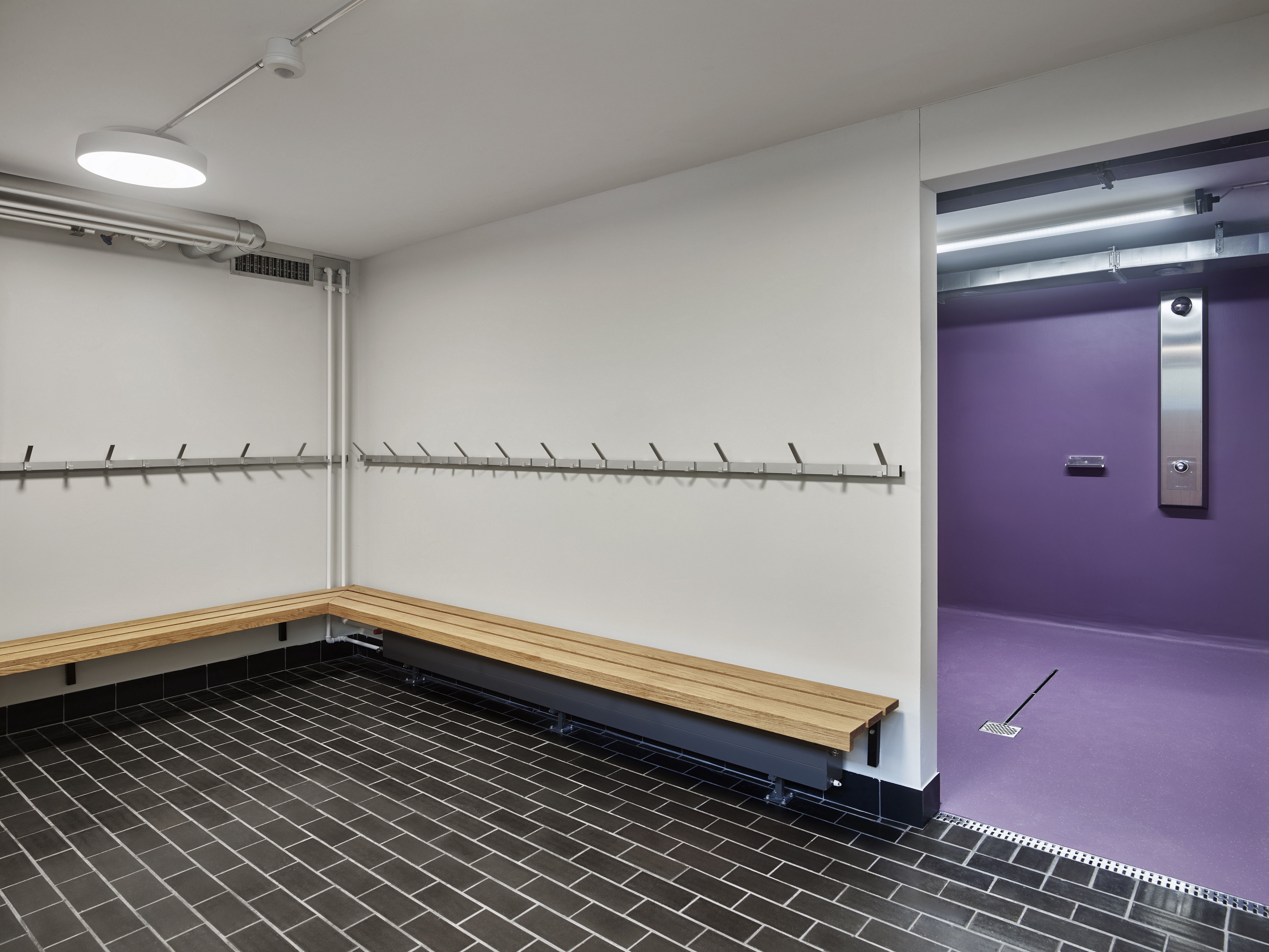 Bei der Sanierung wurde Rücksicht auf die bestehenden Materialien genommen, defekte Wandplatten oder Sichtbacksteine wurden mit ähnlichen ersetzt. Durch die farbliche Akzentuierung der neuen Eingriffe konnte eine ausgeglichene Balance zwischen Alt und Neu geschaffen werden. Der Sporthallenboden zum Beispiel ist mit einem goldgelben Belag bedeckt. In Kombination mit den bestehenden Backsteinwänden und der komplett erneuerten Fensterfront wirkt die Halle auf diese Weise hell und freundlich. Die Turnhalle verfügt nun über neue Sportgeräte und eine Boulderwand. Die Wand- und Bodenplatten in den Sanitärräumen mussten ausgewechselt werden. Das Farbkonzept wurde hier mit einem leuchtend violetten Anstrich umgesetzt.