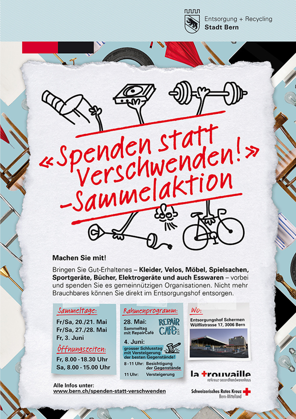 In Zusammenarbeit mit Entsorgung + Recycling Stadt Bern sammelt das Rotkreuz-Secondhandwarenhaus la trouvaille vom 20. Mai bis 3. Juni (jeweils Freitag/Samstag) im Entsorgungshof Schermen Ausgedientes aller Art. Die gespendeten Waren kommen verschiedenen gemeinnützigen Organisationen zugute. Am Samstag, 4. Juni findet im Rahmen des Berner Umwelttages eine Versteigerung der attraktivsten Gegenstände statt. Der Erlös aus der Ver-steigerung geht an la trouvaille, welches diesen für karitative Zwecke nutzt.