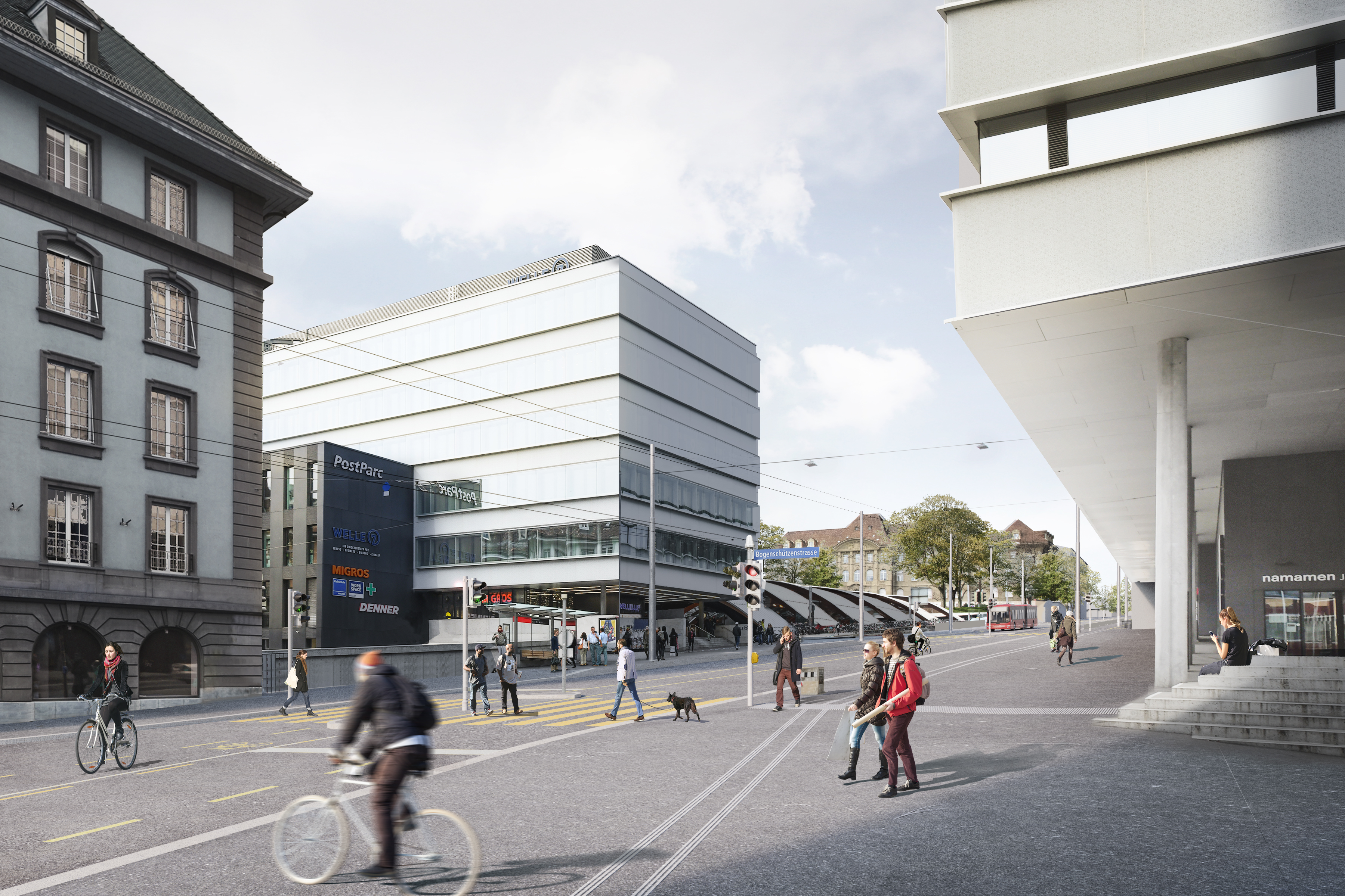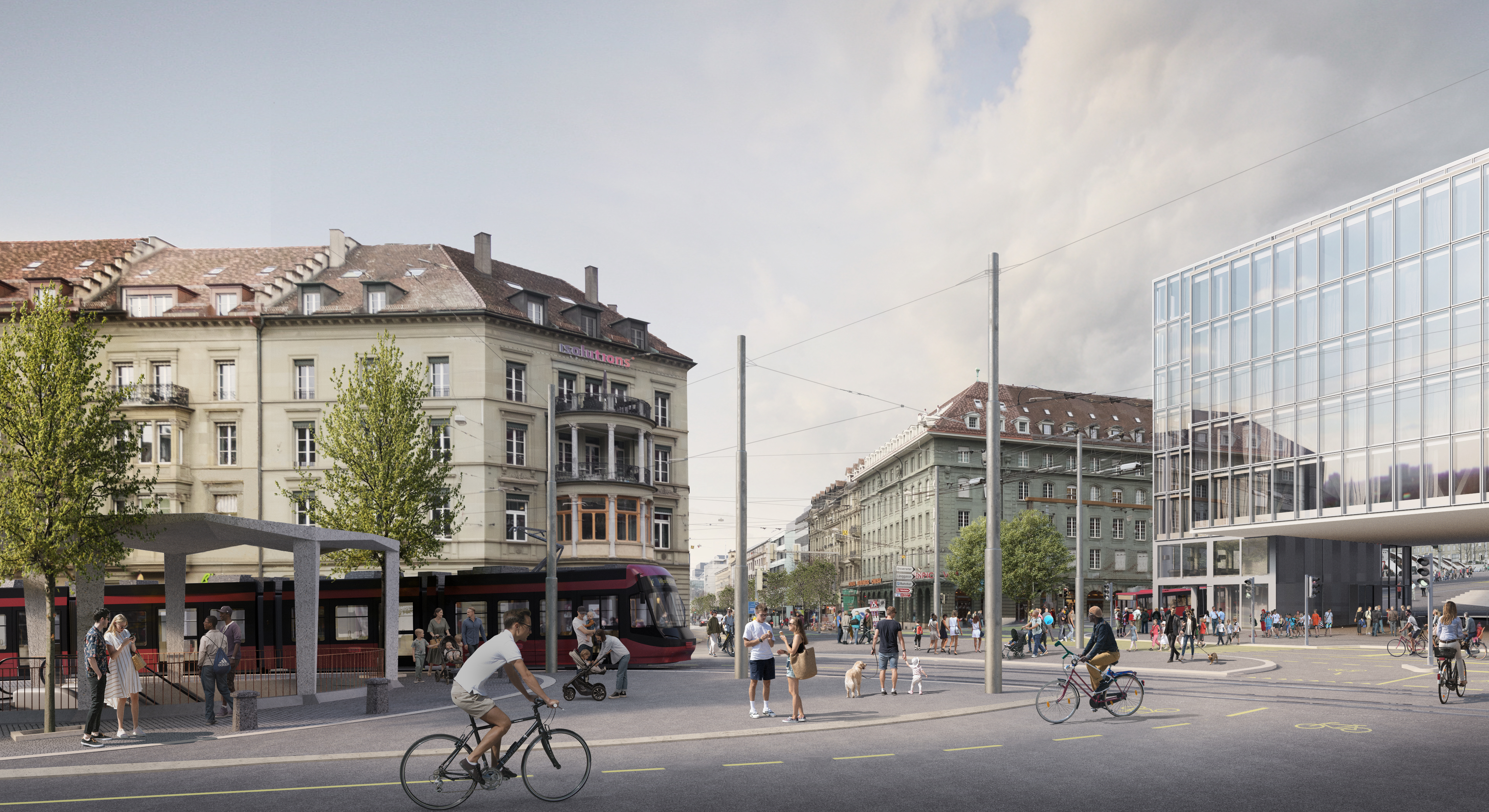 Nutzung ohne Veloparkplätze: Auf dem gesamten Hirschengraben wird keine Veloparkierung mehr stattfinden, sodass der Raum genügend Zirkulations- und Flanierfläche für Passant*innen bietet. Als Ersatz dienen die beiden Velostationen PostParc und Welle 7, langfristig sind zudem im Umfeld des Bahnhofs weitere Velostationen bzw. Angebotsausbauten geplant.
