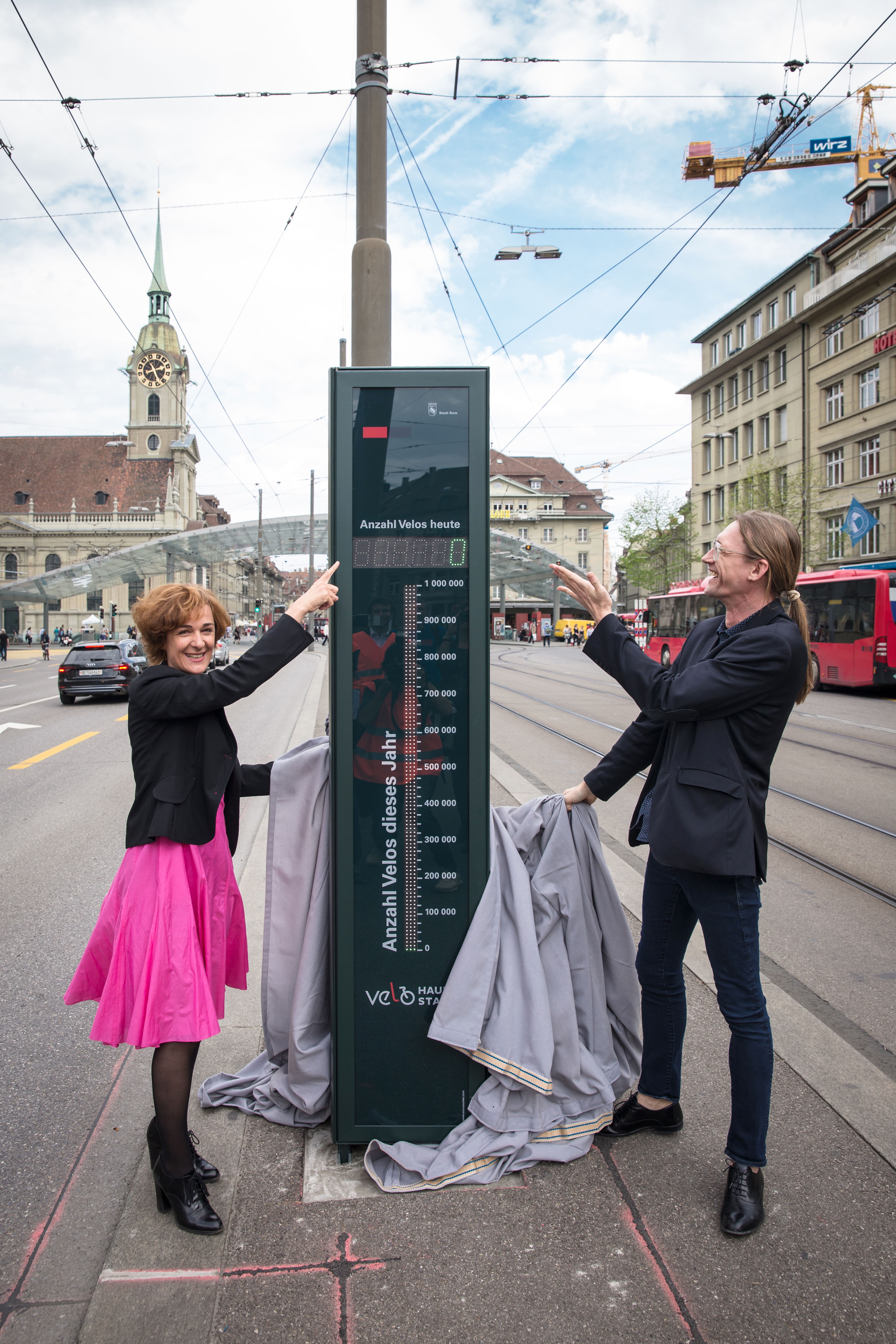 An drei Standorten wird die Velozählung künftig für alle sichtbar: Auf dem Bubenbergplatz, im Monbijou und am Nordring sind ab heute drei sogenannte Velobarometer in Betrieb. Diese zeigen den jeweiligen Tages- und Jahresstand an Velofahrenden am betreffenden Ort an. «Die Barometer zeigen den Velofahrenden, dass sie wahrgenommen werden und willkommen sind», sagte Karl Vogel, Verkehrsplaner der Stadt Bern, welcher am Montag zusammen mit Ursula Wyss den Velobarometer auf dem Bubenbergplatz enthüllte.