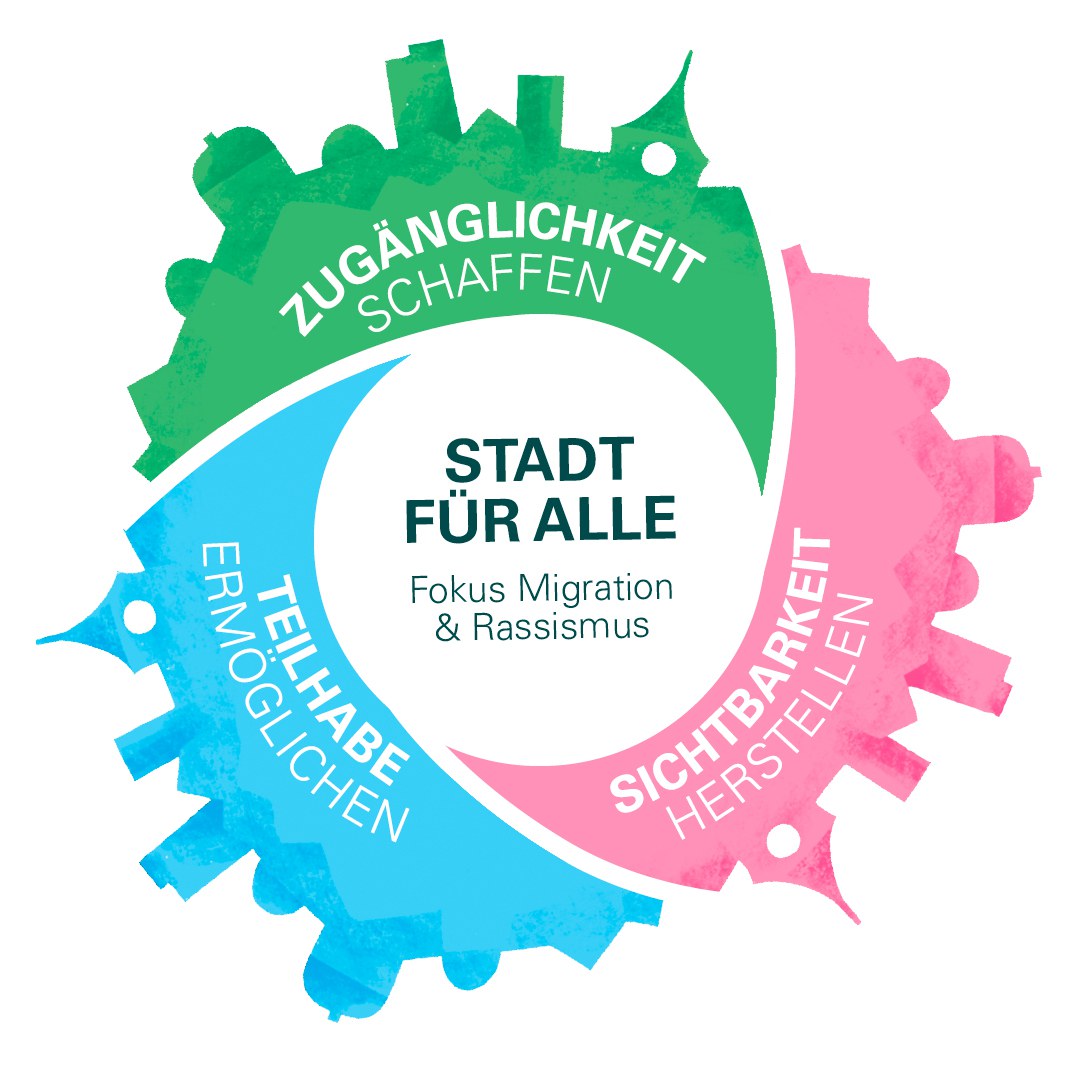 Grundlage der städtischen Arbeit zur Förderung der Teilhabe der Migrationsbevölkerung und zur Bekämpfung von Rassismus ist das Modell «Stadt für alle» mit Fokus auf Migration und Rassismus. Es orientiert sich an den drei Handlungsbereichen Zugänglichkeit, Teilhabe und Sichtbarkeit.