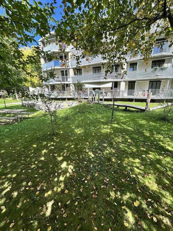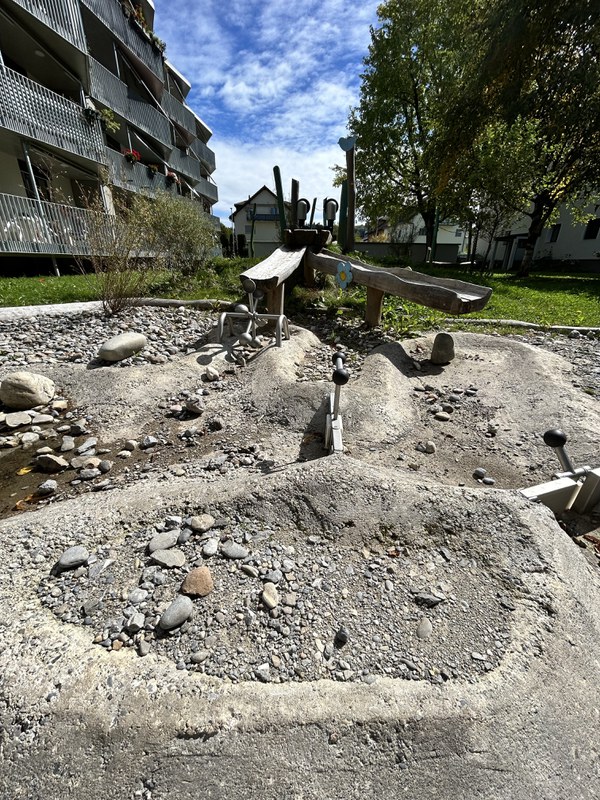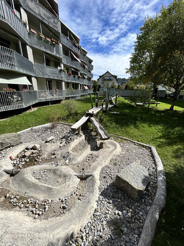 So entstand aus der einst einfachen Rasenfläche ein attraktiver Aussenraum, der den Austausch der Mietenden unterstützt, das Nachbarschaftsverhältnis stärkt und die Biodiversität fördert. Die neuen Elemente umfassen unter anderem eine Kies- und Wasserlandschaft, Trockenmauerelemente, Spielhügel sowie eine Grillstelle mit Sitzgelegenheiten.