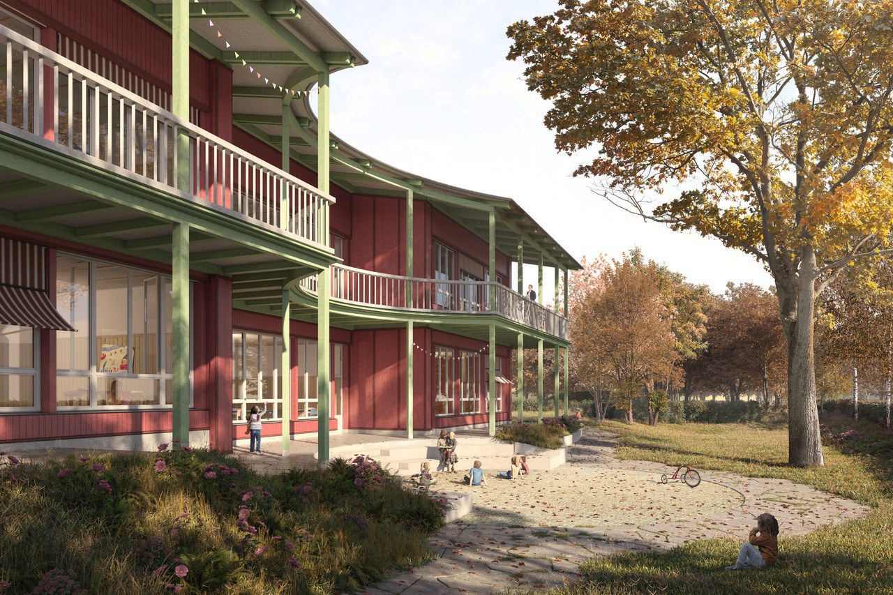 Der Kindergarten liegt in einer parkähnlichen Grünanlage mit zahlreichen alten Bäumen, die grösstenteils erhalten bleiben. Die beiden Areale der Schule und der öffentlichen Grünanlage werden neu miteinander verbunden, aufgewertet und besser zugänglich gemacht. So entsteht ein zusammenhängender, vielfältig nutzbarer Aussenraum für Kinder und Quartierbevölkerung.