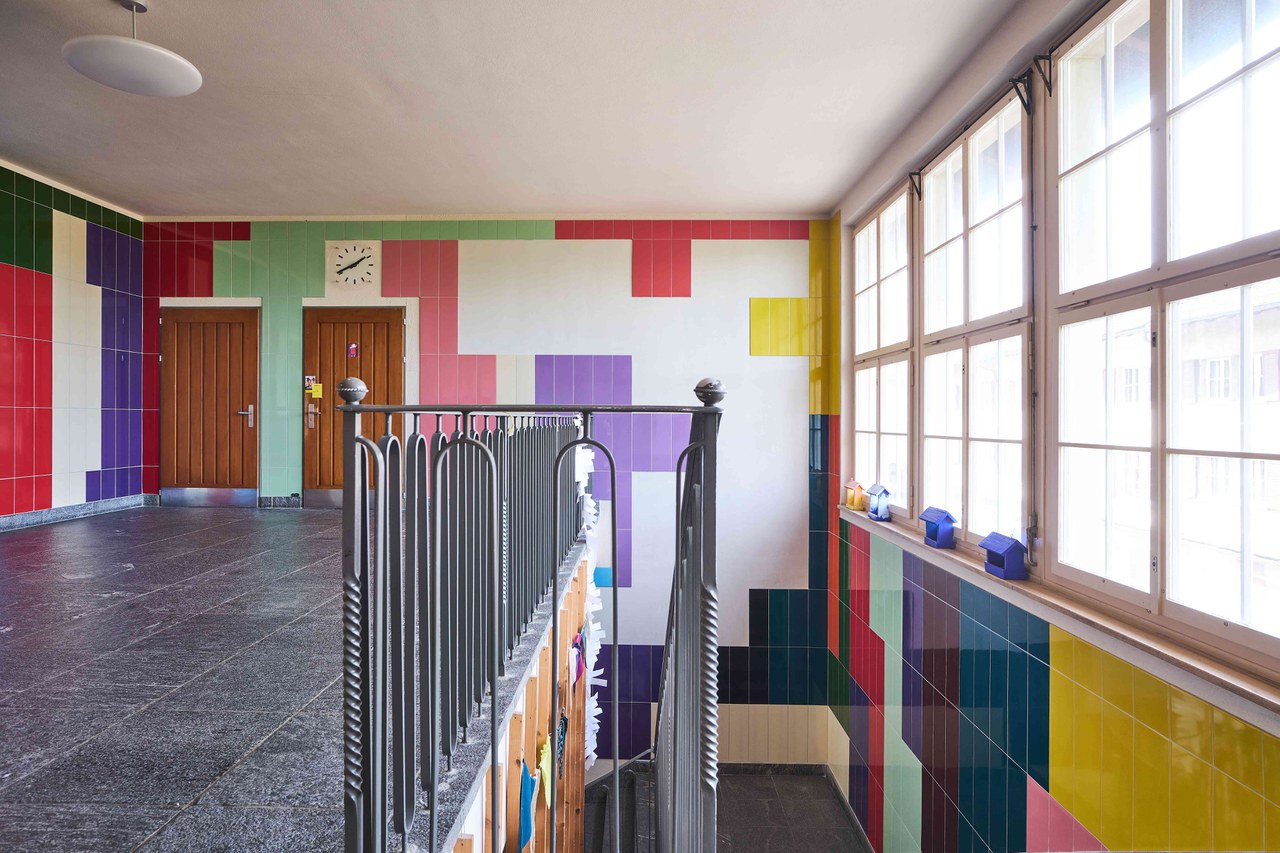 Die im Frühling 2025 realisierte Wandarbeit aus verschiedenfarbigen Keramikplatten erstreckt sich über die drei Etagen des Treppenhauses und lässt vorerst jene Stelle frei, an der das entfernte Wandalphabet von Eugen Jordi und Emil Zbinden zu sehen war. Über die kommenden Jahre soll die Leerstelle in einem vom Verein konzipierten, partizipativen Erinnerungs- und Verlernensprozess mit den Schüler*innen und Lehrpersonen gefüllt werden.