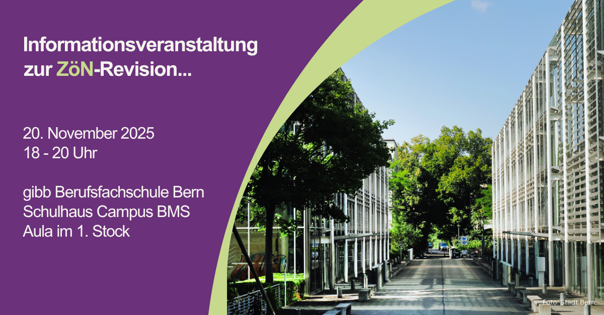 Öffentlicher Informationsanlass zur ZöN-Revision Zeit: Donnerstag, 20. November 2025, 18.00–20.00 Uhr Ort: gibb Berufsfachschule Bern, Schulhaus Campus BMS, Aula im 1. Stock (Raum BM 130), Lorrainestrasse 5a, 3013 Bern |