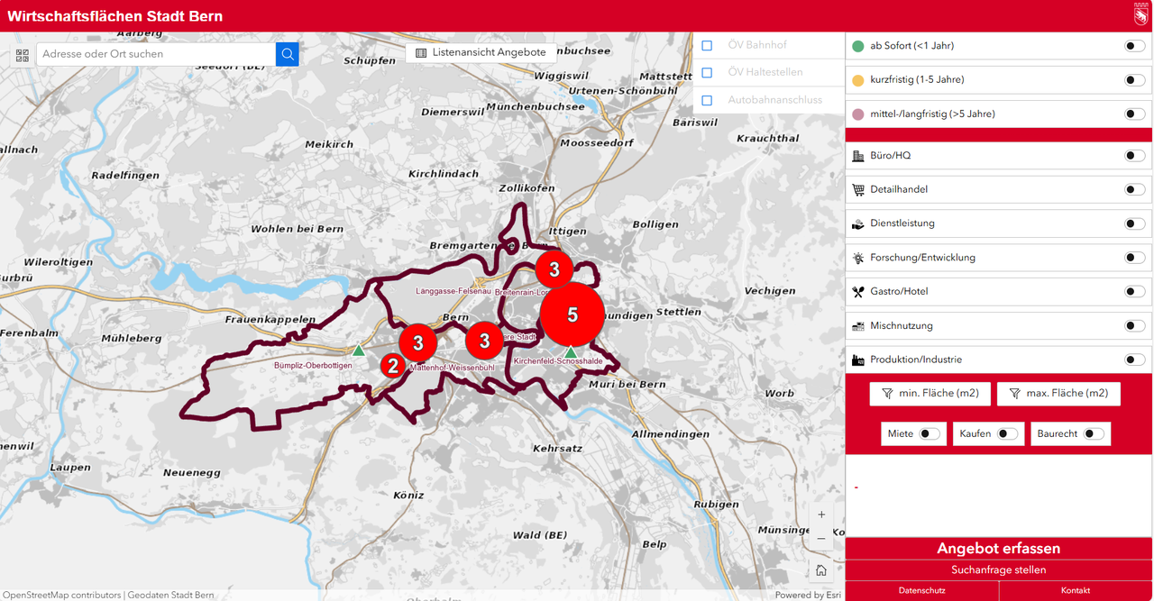 Unser Online-Tool unterstützt Sie bei der Standortsuche: Mit wenigen Klicks erhalten Sie detaillierte Informationen zu Flächengrössen, Nutzungsmöglichkeiten und Kontaktpersonen. Stadt und Agglomeration Bern setzen auf wirtschaftliche Vielfalt und bietet ideale Rahmenbedingungen für zukunftsorientierte Unternehmen.