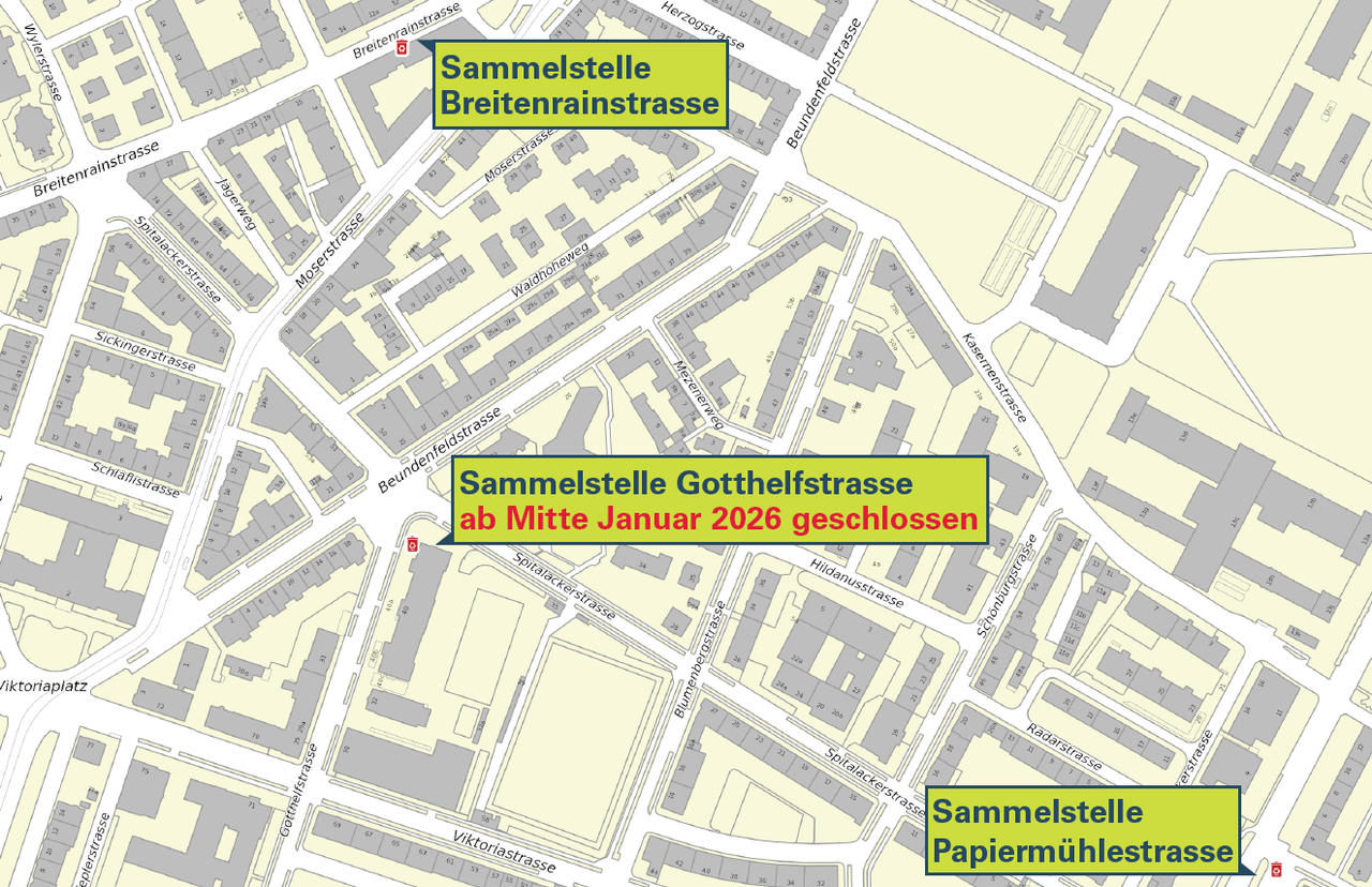 Die Sammelstelle an der Gotthelfstrasse beim Schulhaus Spitalacker wird aus Sicherheitsgründen per 17. Januar 2026 aufgehoben. Die nächstgelegenen Sammelstellen befinden sich an der Breitenrainstrasse oder an der Papiermühlestrasse.