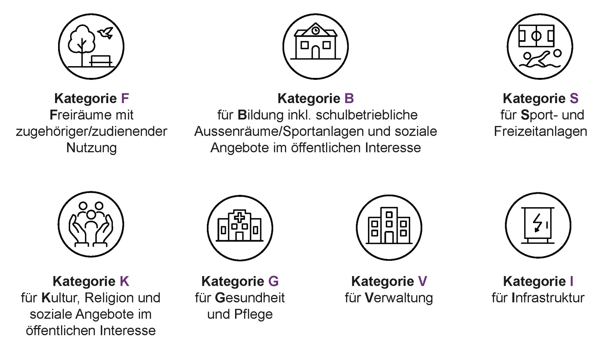 - Die Kategorie «Bildung, inklusive schulbetriebliche Aussenräume/Sportanlagen und soziale Angebote im öffentlichen Interesse» (B) beinhaltet z. B. Kindergärten, Kindertagesstätten, Schulen mit Pausenplatz und Fachhochschulen.