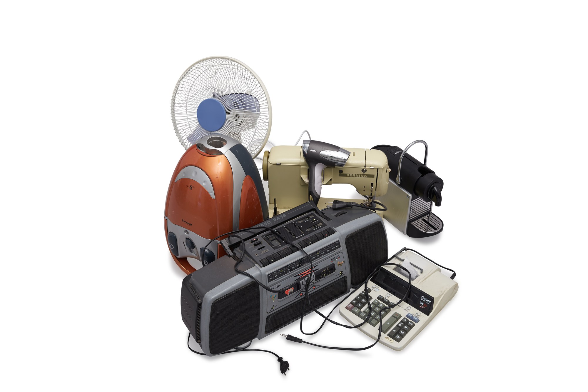 Elektrische und elektronische Geräte aus Privathaushalten wie Fernseher, TV-Geräte, Computer und Laptops, EDV-Systeme und deren Zubehör, Bildschirme, Tastaturen, externe Speicher, Harddisks, Memorysticks, USB-Sticks, Modems, Scanner, Drucker, Toner, Druckerpatronen, Plotter, Bänder, Kassensysteme, Telefonapparate, Handys und Smartphones, Kopiergeräte, Schreibmaschinen, Faxgeräte, Aktenvernichter, Lautsprecher, Camcorder, Projektoren, Digital- und Analogkameras, Kassetten, DVDs, CDs, Schallplatten (Vinyl), Dias, Stereoanlagen, Radios, CD-Player, Videokameras und -recorder, HiFi-Geräte, Haartrockner, Föhn, elektronische Spielsachen, Küchengeräte, Waschmaschinen, Tumbler, Rasenmäher, Lampen, Mikrowelle, Toaster, Staubsauger, Sicherungen, Solarpanel etc.