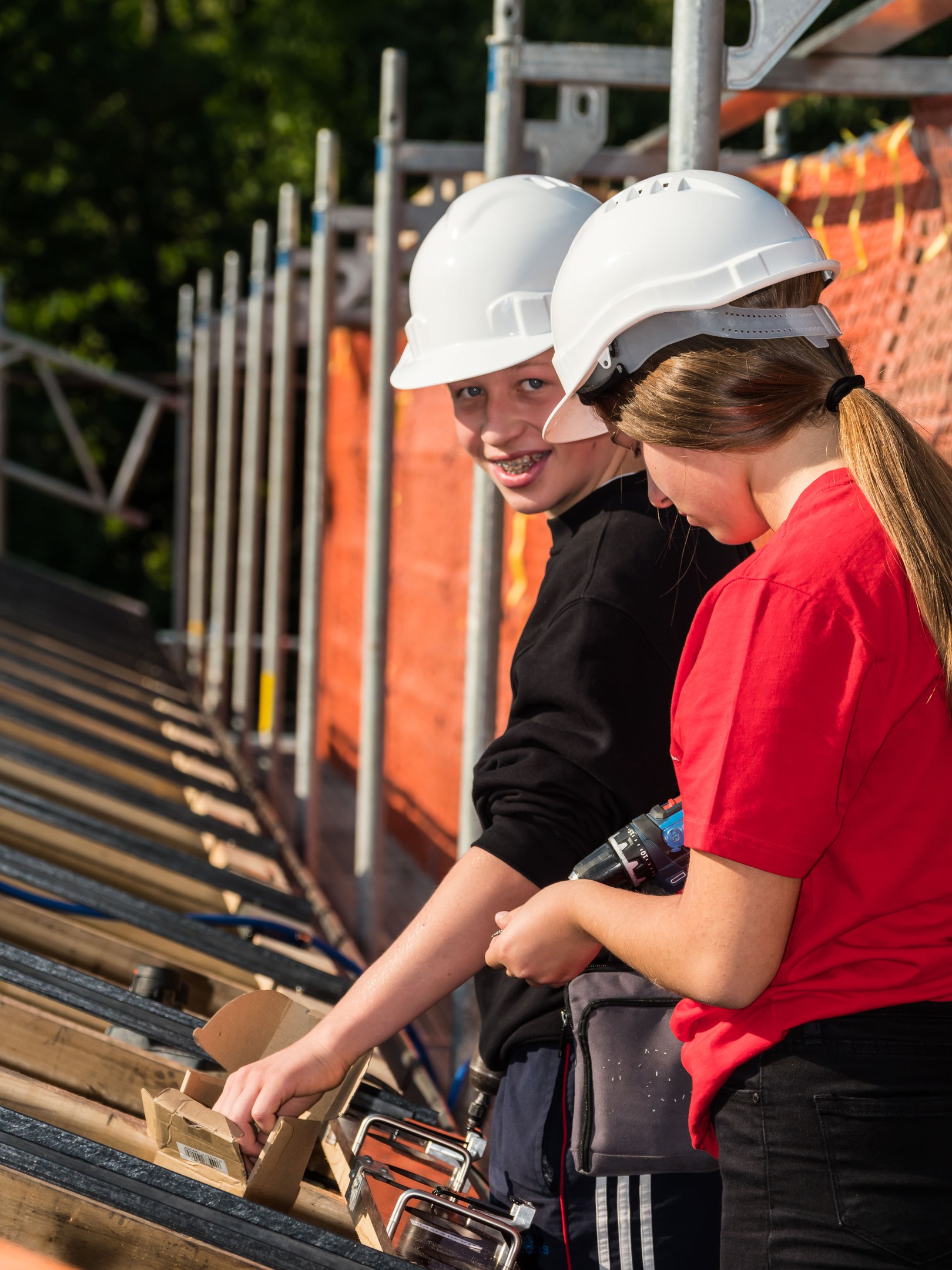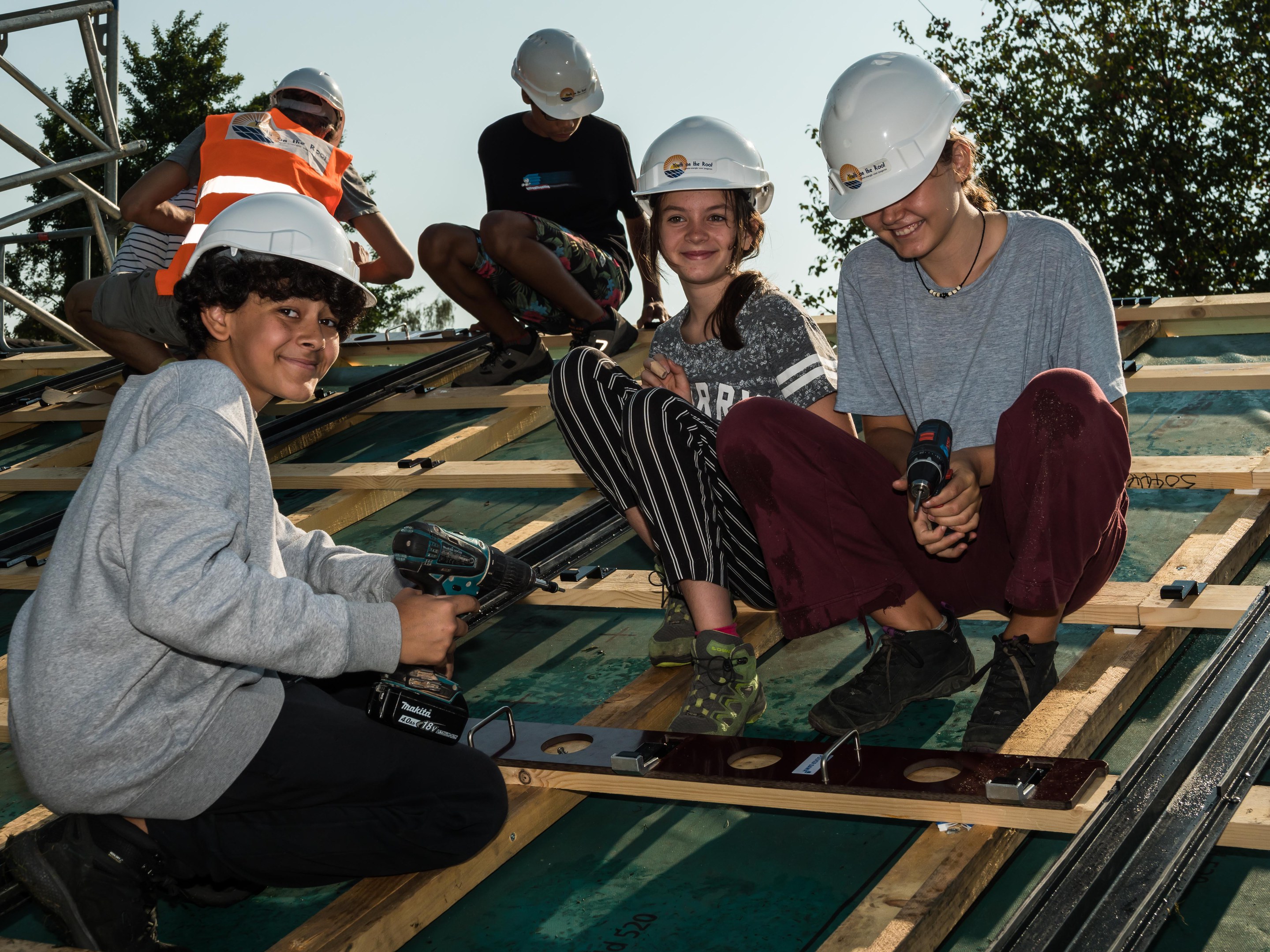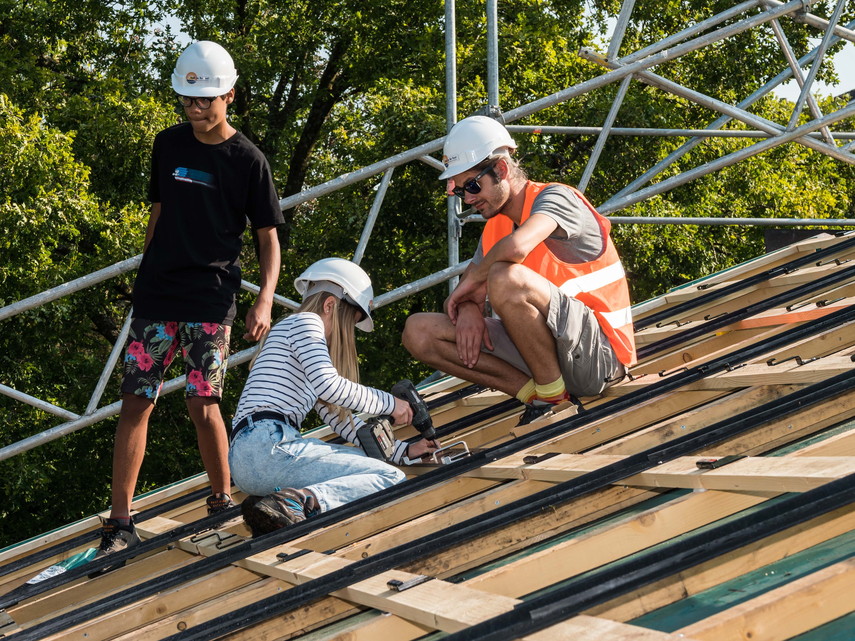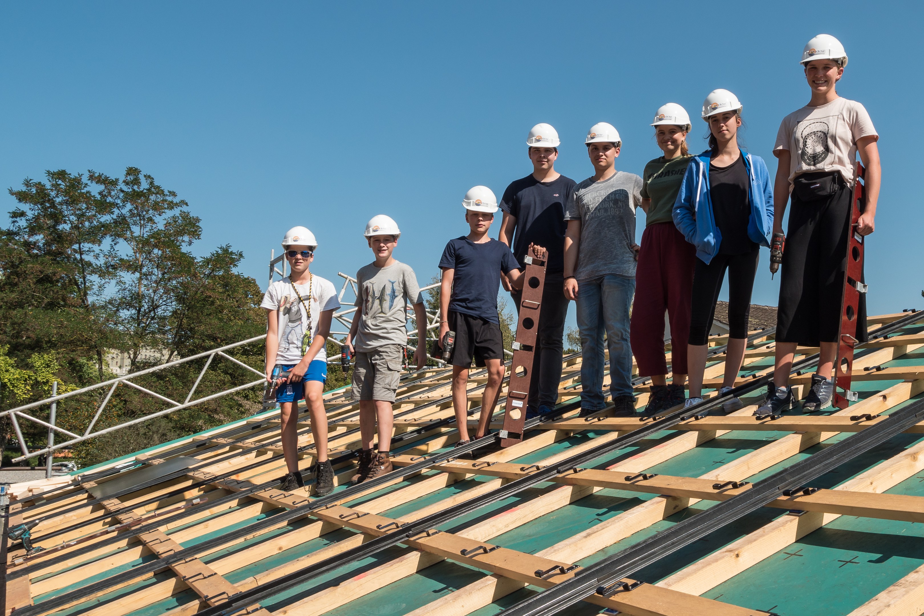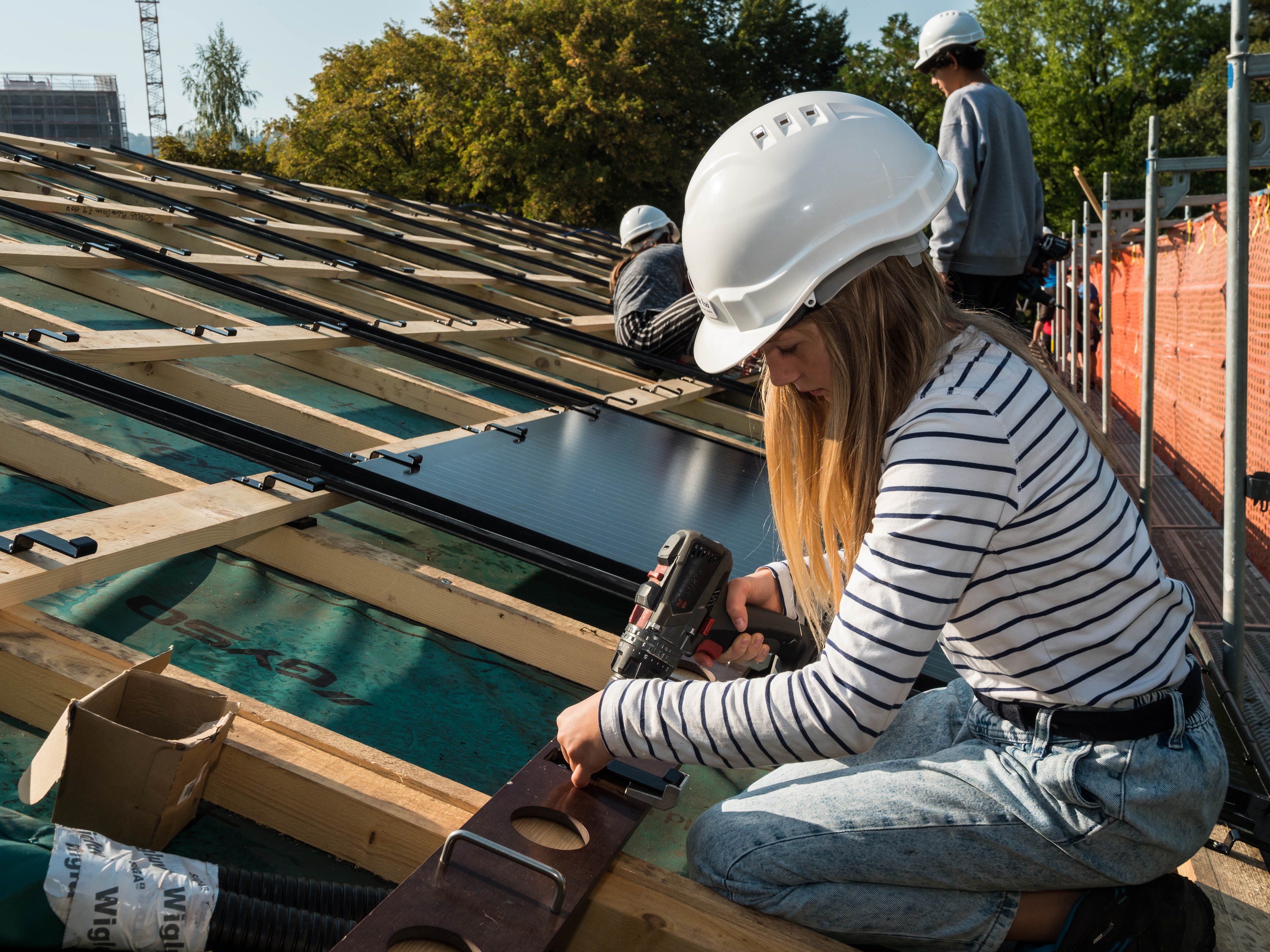 Jeden Tag arbeitet eine Gruppe von 10 Schülerinnen und Schüler auf dem Dach. Heute wurde noch nicht mit Solarpanels gearbeitet. Die Jugendlichen schraubten Haken fest damit die Panels installiert werden können. Diese werden in den folgenden Tagen montiert. Nach unserer Umfrage sind die meisten Schüler und Schülerinnen motiviert und der Meinung, dass die Arbeit auf dem Dach sehr interessant und nicht allzu anstrengend ist. Eine Schülerin der Klasse 2A sagt dazu, dass es sehr motivierend sei, etwas für die Umwelt zu tun, denn damit habe die Volksschule Marzili umweltfreundlicheren Strom.