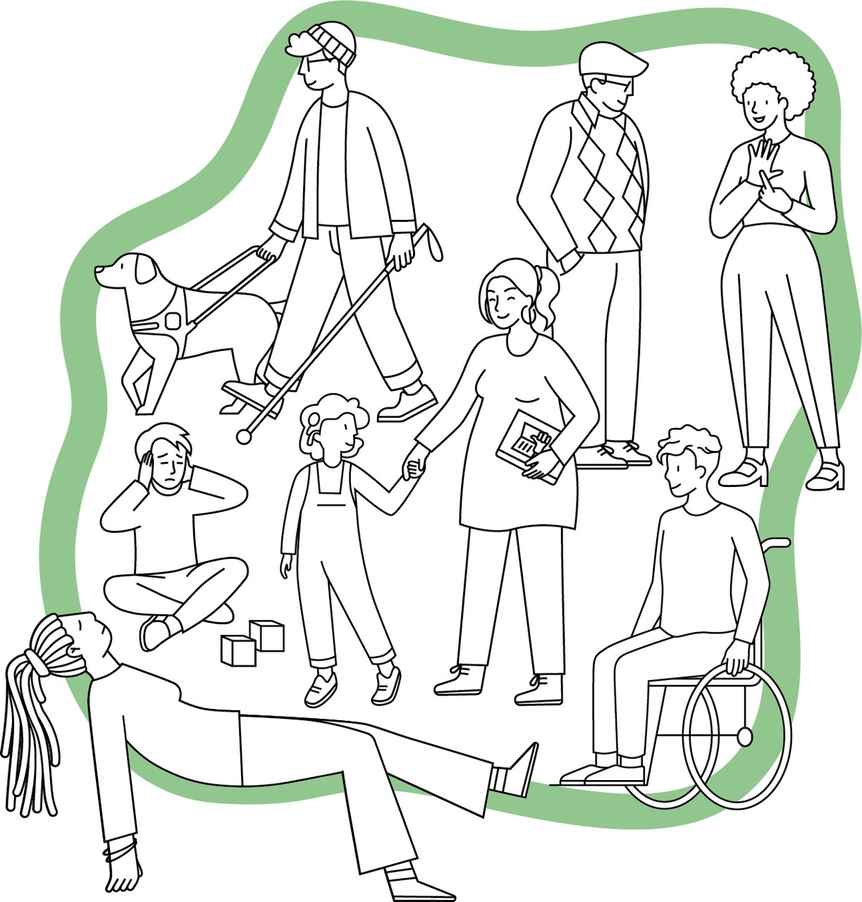Die Darstellung des Inklusionskreises veranschaulicht dies. Der grüne Kreis umfasst Menschen mit sicht- und unsichtbaren Behinderungen sowie ohne Behinderungen. Der Inklusionskreis kann sich den unterschiedlichen Bedürfnissen anpassen und seine Form verändern.