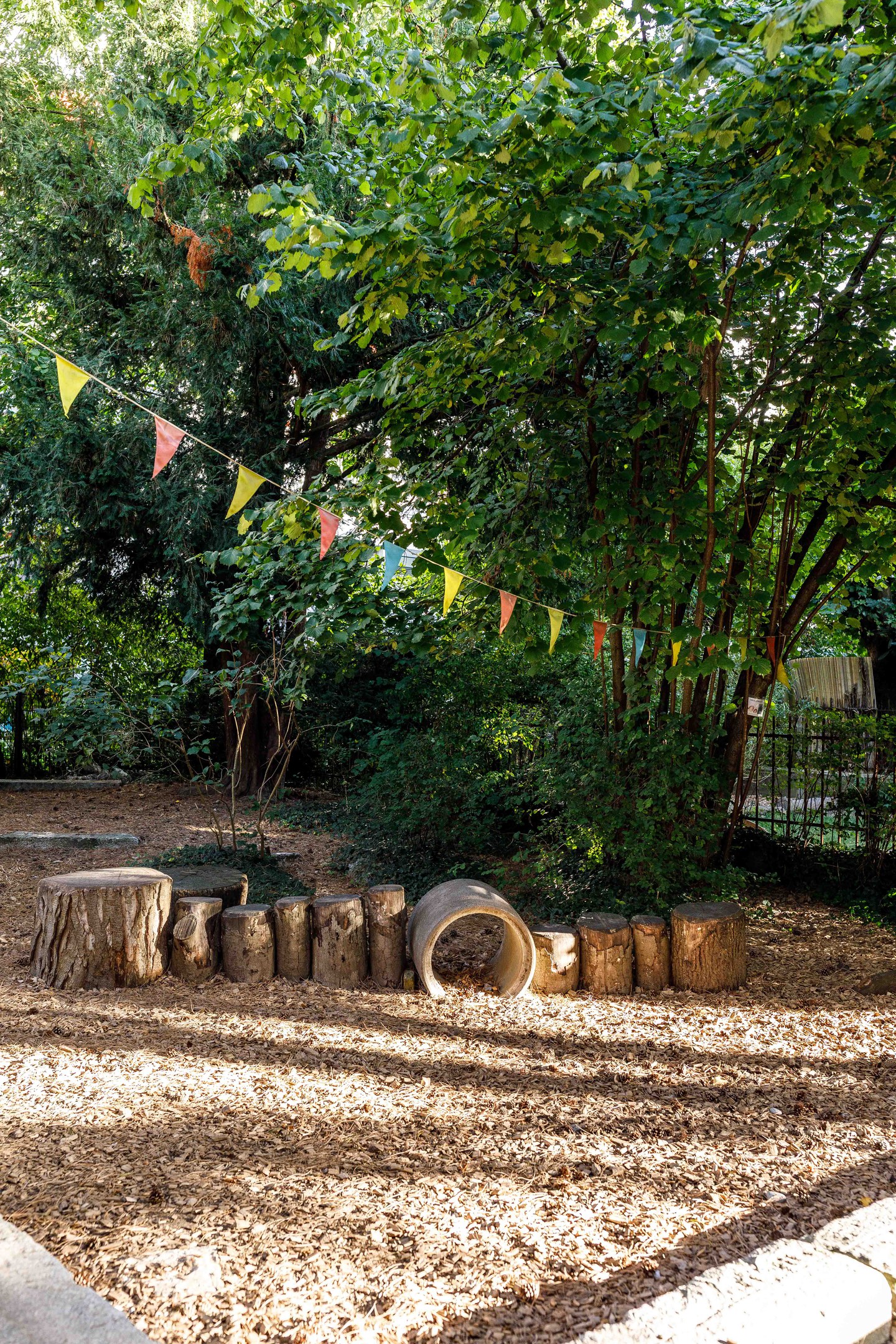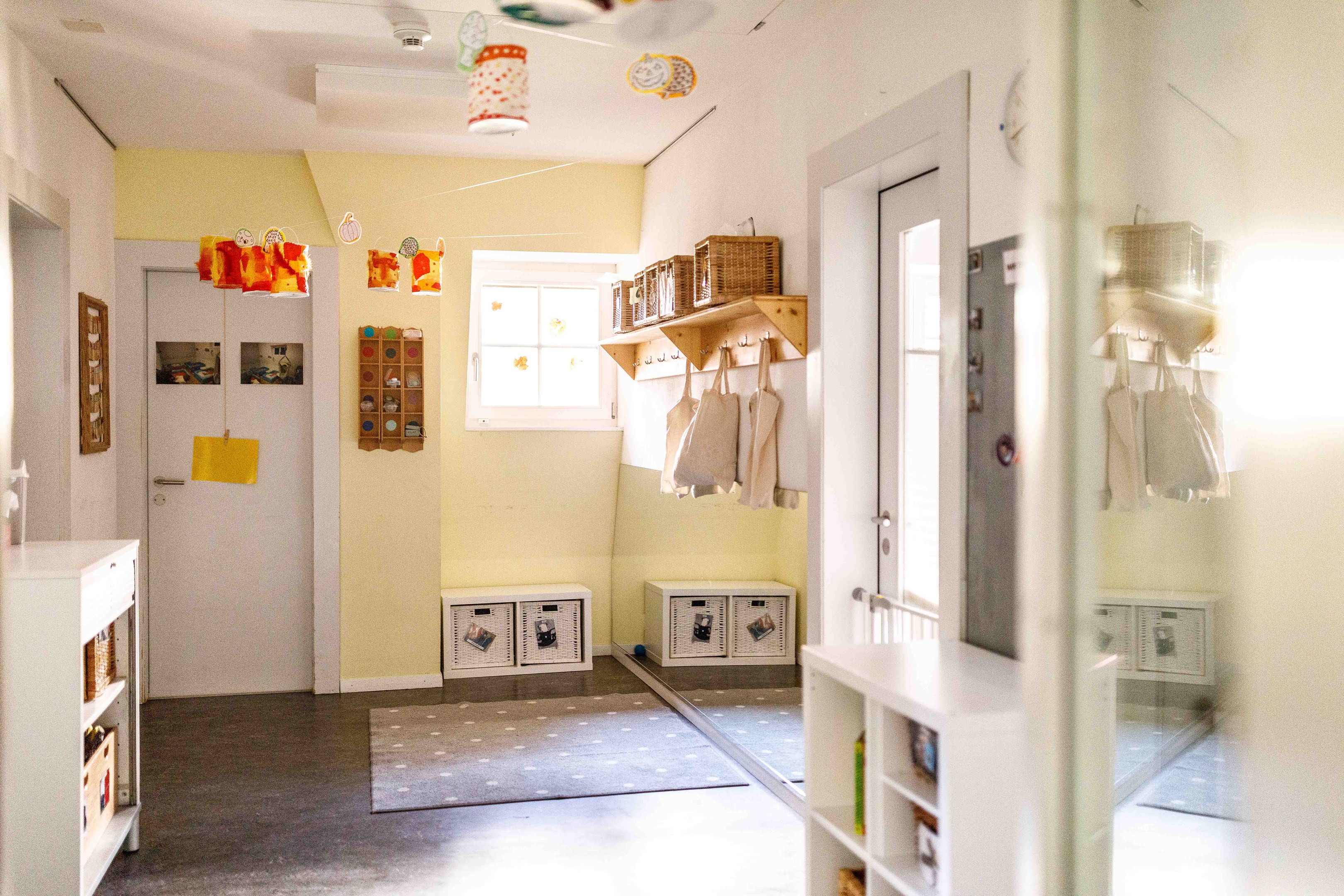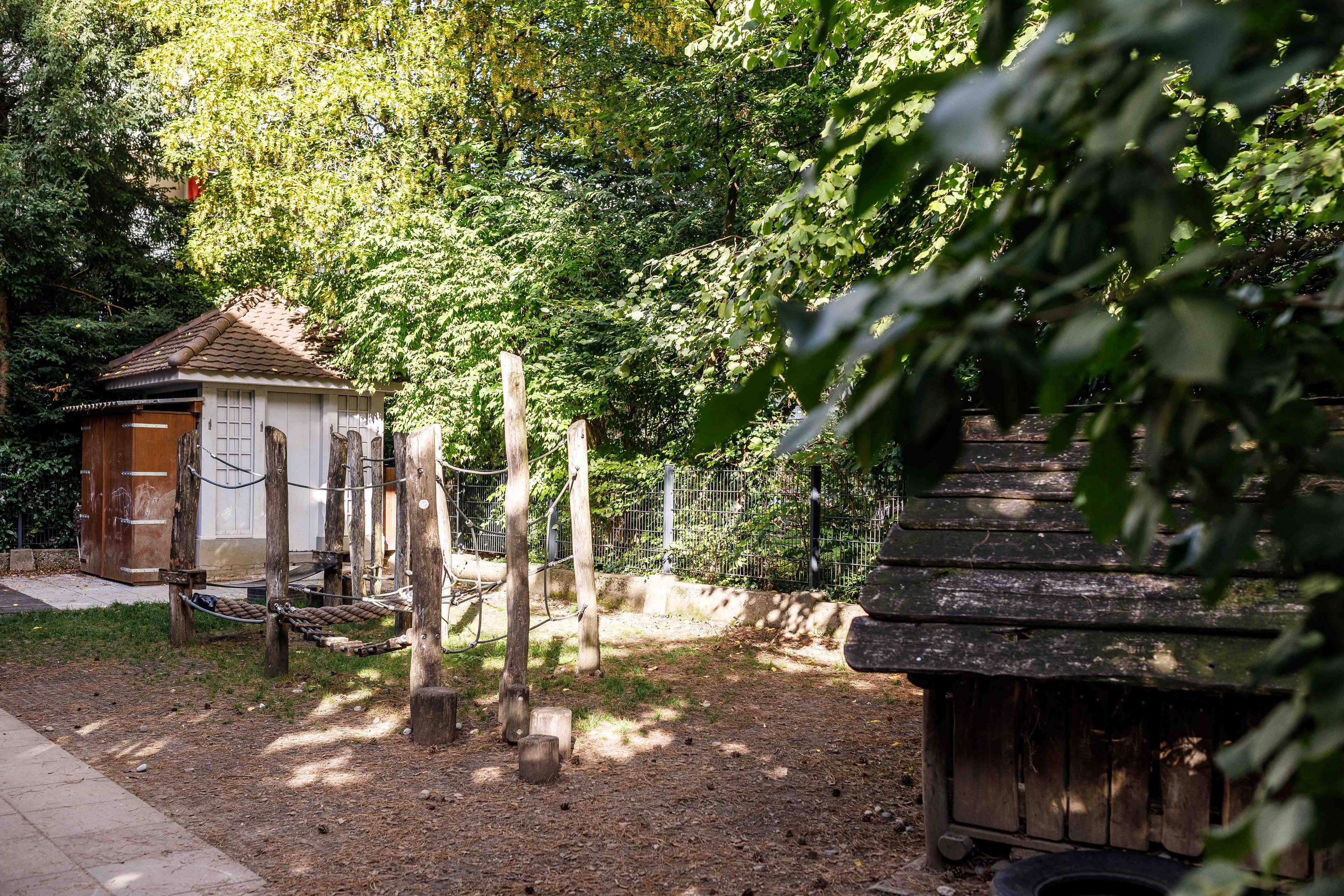 Unsere vielfältige Gartenlandschaft bietet Ihrem Kind einen Riesen-Sandkasten, ein Weidenhäuschen, Kleinkinderspielgerät, ein Wäldchen, Spielhäuschen, einen Themenschrank und Spielnischen.