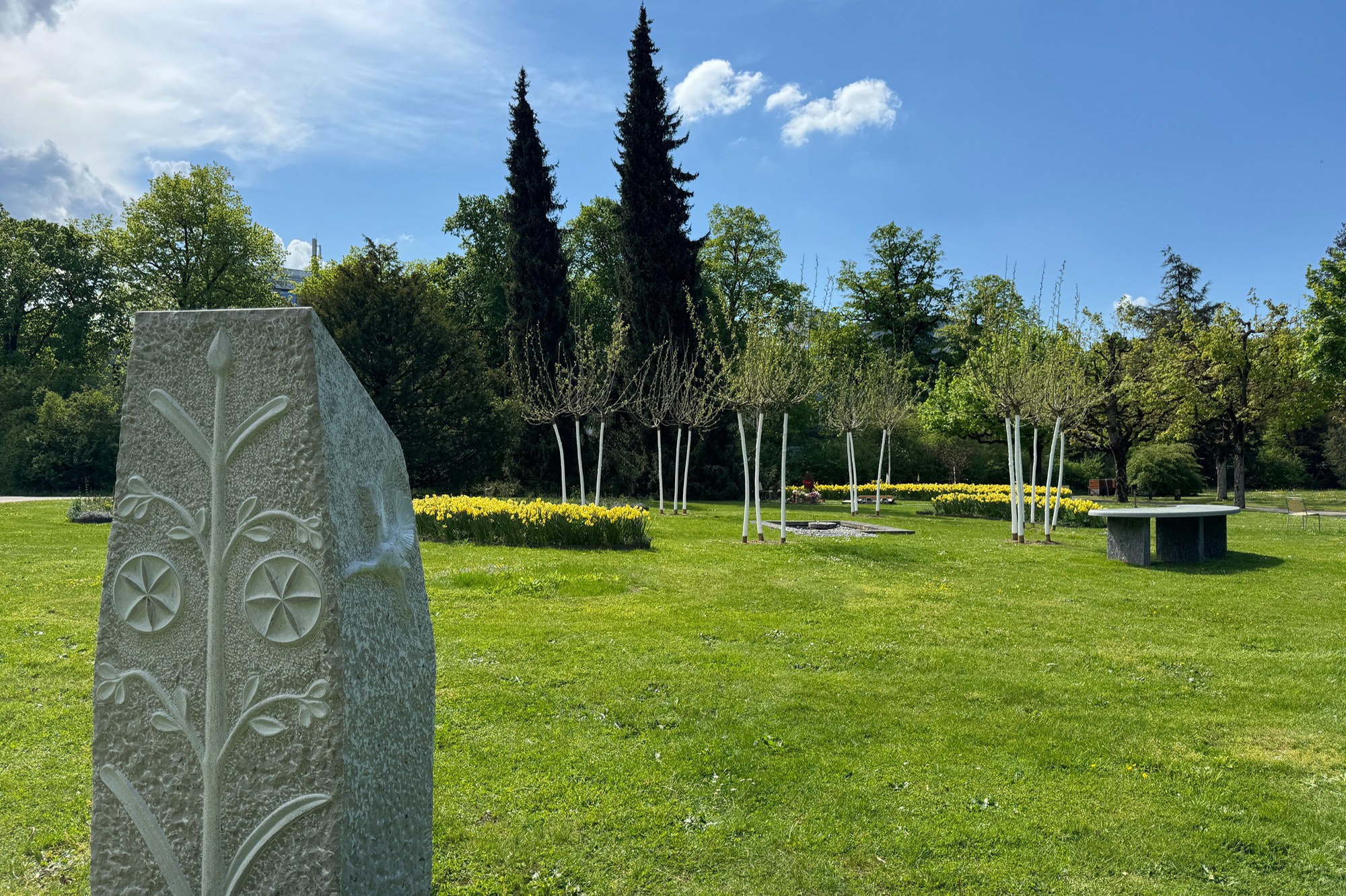 Das Grabfeld für Angehörige der alevitischen Gemeinschaft ist ein Sargreihengrab, bei dem die einzelnen Gräber nach Osten ausgerichtet sind. Die Gestaltung und Farbgebung der Grabfeldelemente (Skulptur, Blumenrabatten, Bäume und Mobiliar) greifen die Drehbewegung aus dem Tanzgebet «Semah» auf und spiegeln wichtige religiöse Symboliken wider. Mehr dazu in der Medienmitteilung vom 5. Mai 2025.