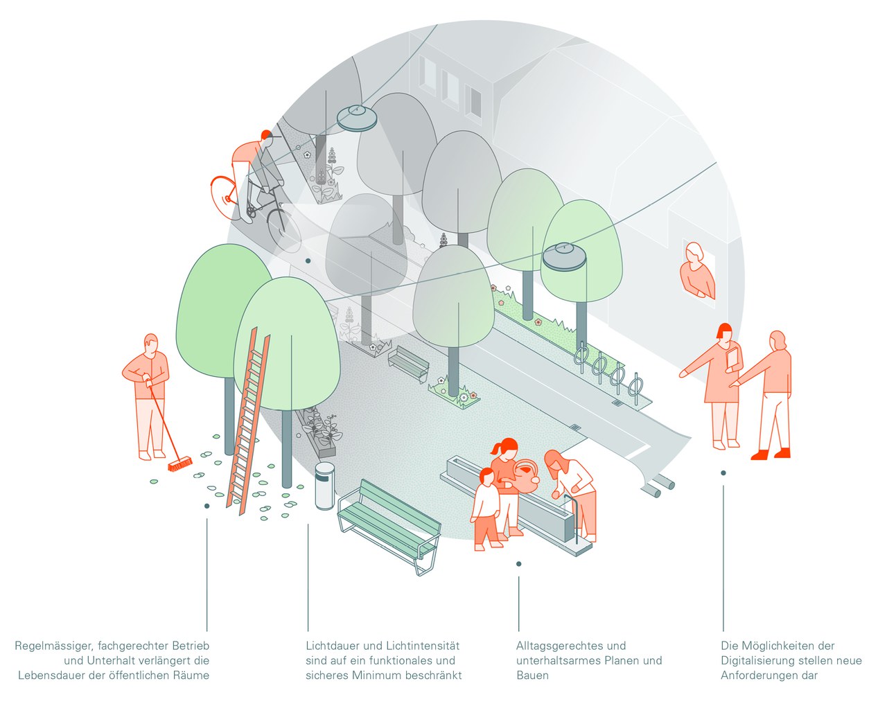 Öffentliche Räume sollten rund um die Uhr und in jeder Jahreszeit funktionieren. Entscheidend dabei sind der regelmässige und fachgerechte Betrieb und Unterhalt, denn instand gehaltene öffentliche Räume mit ihren Infrastrukturen vermitteln ein angenehmes Raumgefühl, fördern die Aufenthaltsqualität und sind das A und O für die positive Wahrnehmung der Stadt.