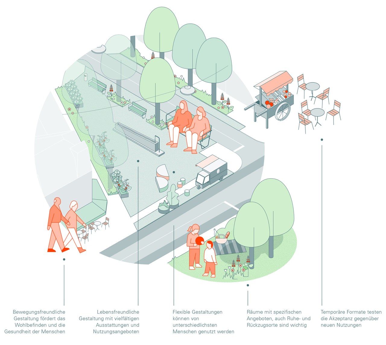 Das Zusammenspiel verschiedener qualitätsvoller Freiraumtypen ergänzt sich gegenseitig und bietet den Menschen unterschiedliche Entfaltungsmöglichkeiten.