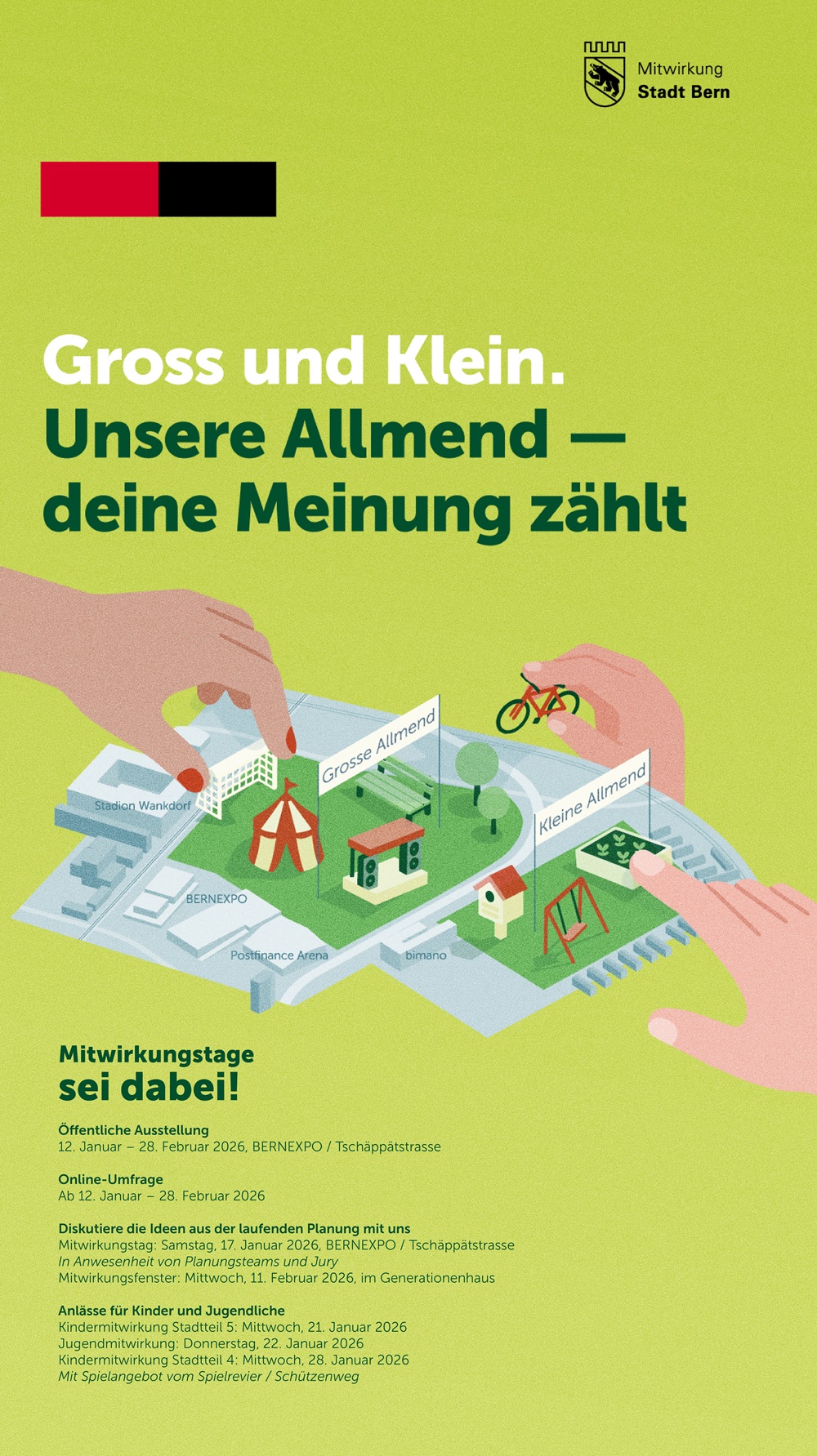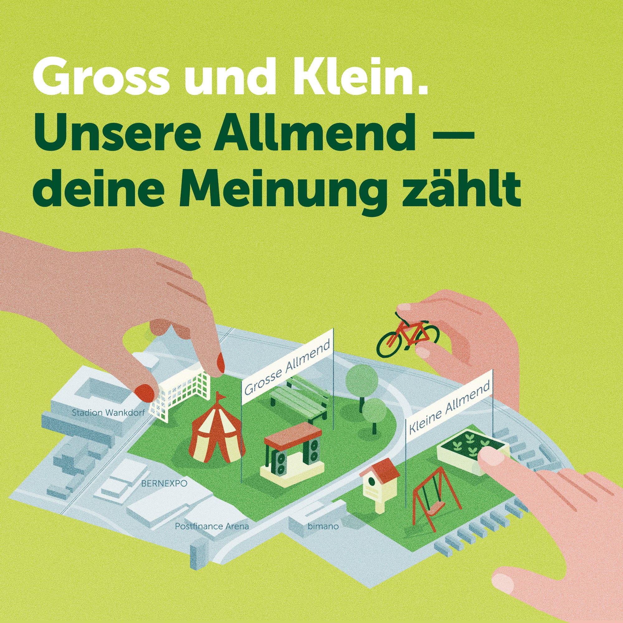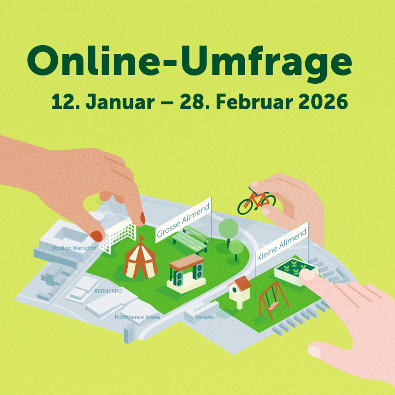 Die Grosse und die Kleine Allmend sind wichtige gemeinschaftlich genutzte Frei- und Grünräume. Sie bieten Platz für eine Vielzahl an Veranstaltungen und Aktivitäten. Damit der Raum auch künftig optimal genutzt werden kann, entwickelt die Stadt Bern die Gestaltung und Nutzung der Allmenden weiter. Ab 12. Januar bis 28. Februar 2026 ist die Bevölkerung zur Mitwirkung eingeladen.
