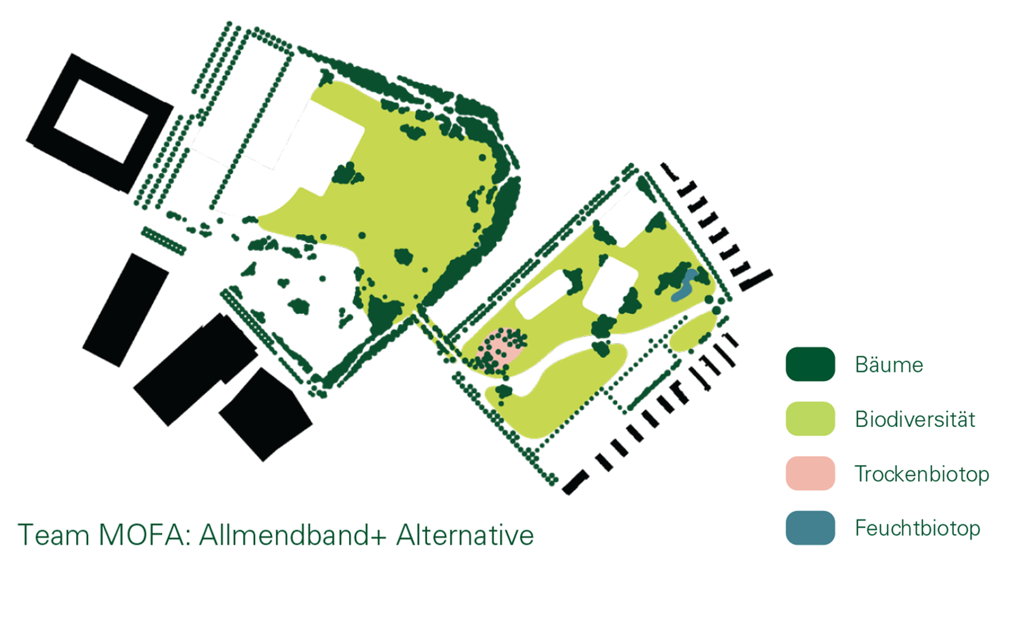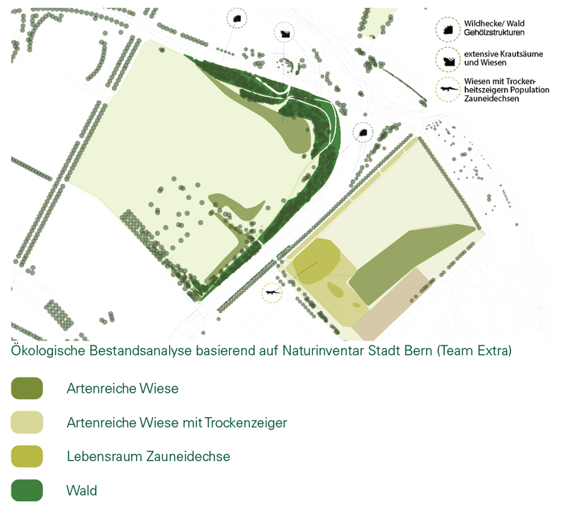 - Auf der Kleinen Allmend liegt der Fokus auf dem Erhalt des bestehenden Trockenbiotops (Zauneidechsen). Mehrere Varianten schlagen ein neues Feuchtbiotop als zusätzlichen Lebensraum vor.