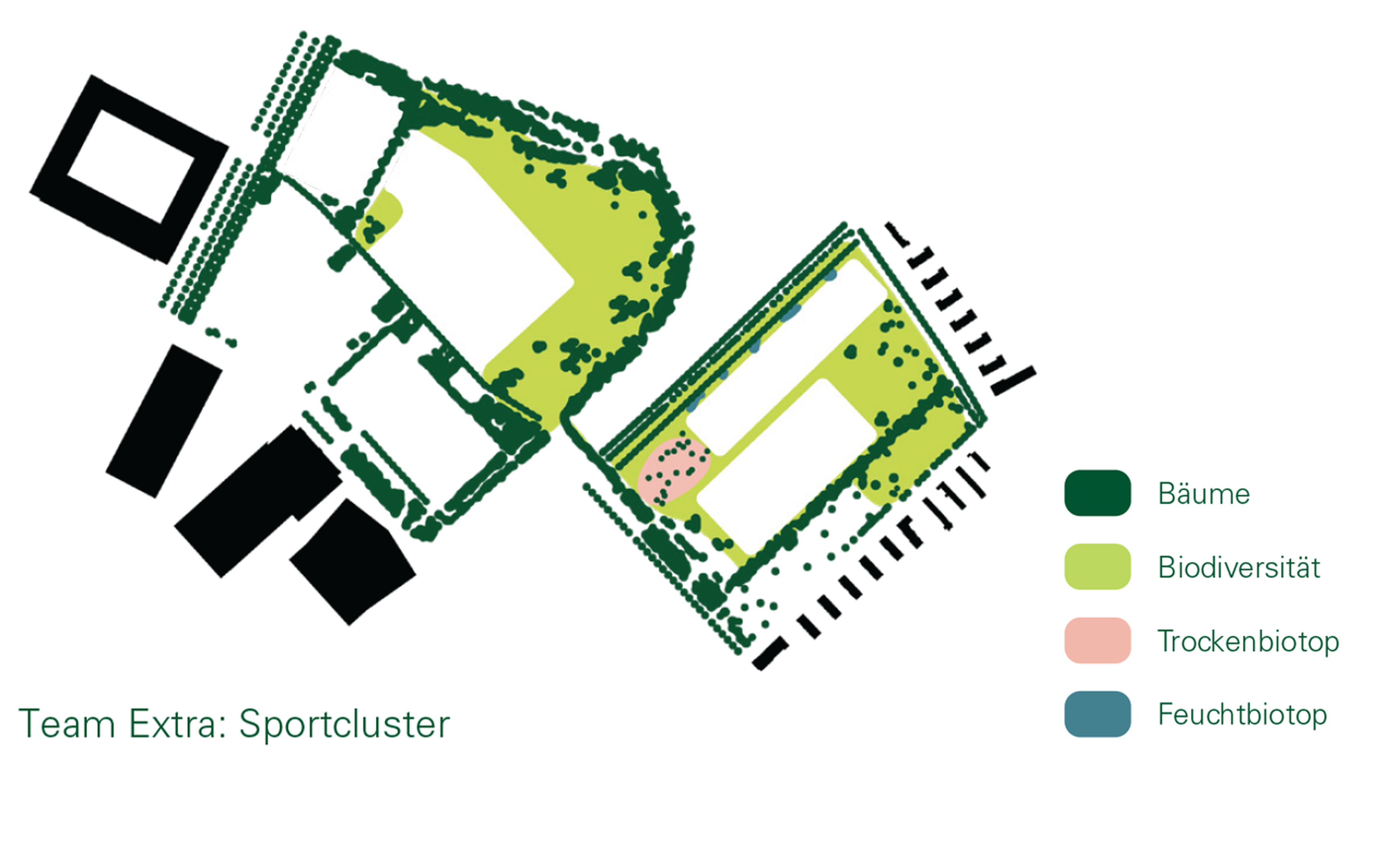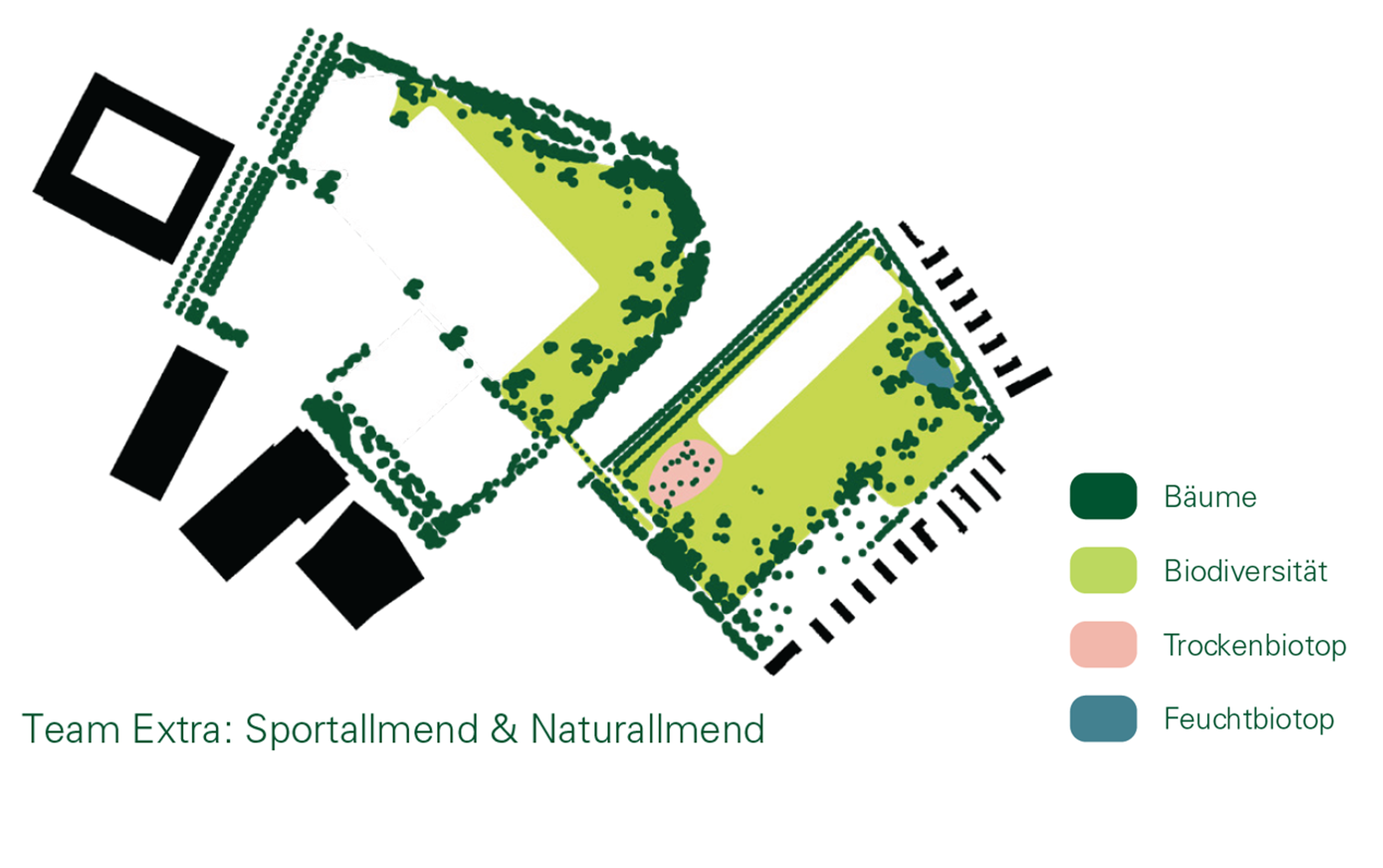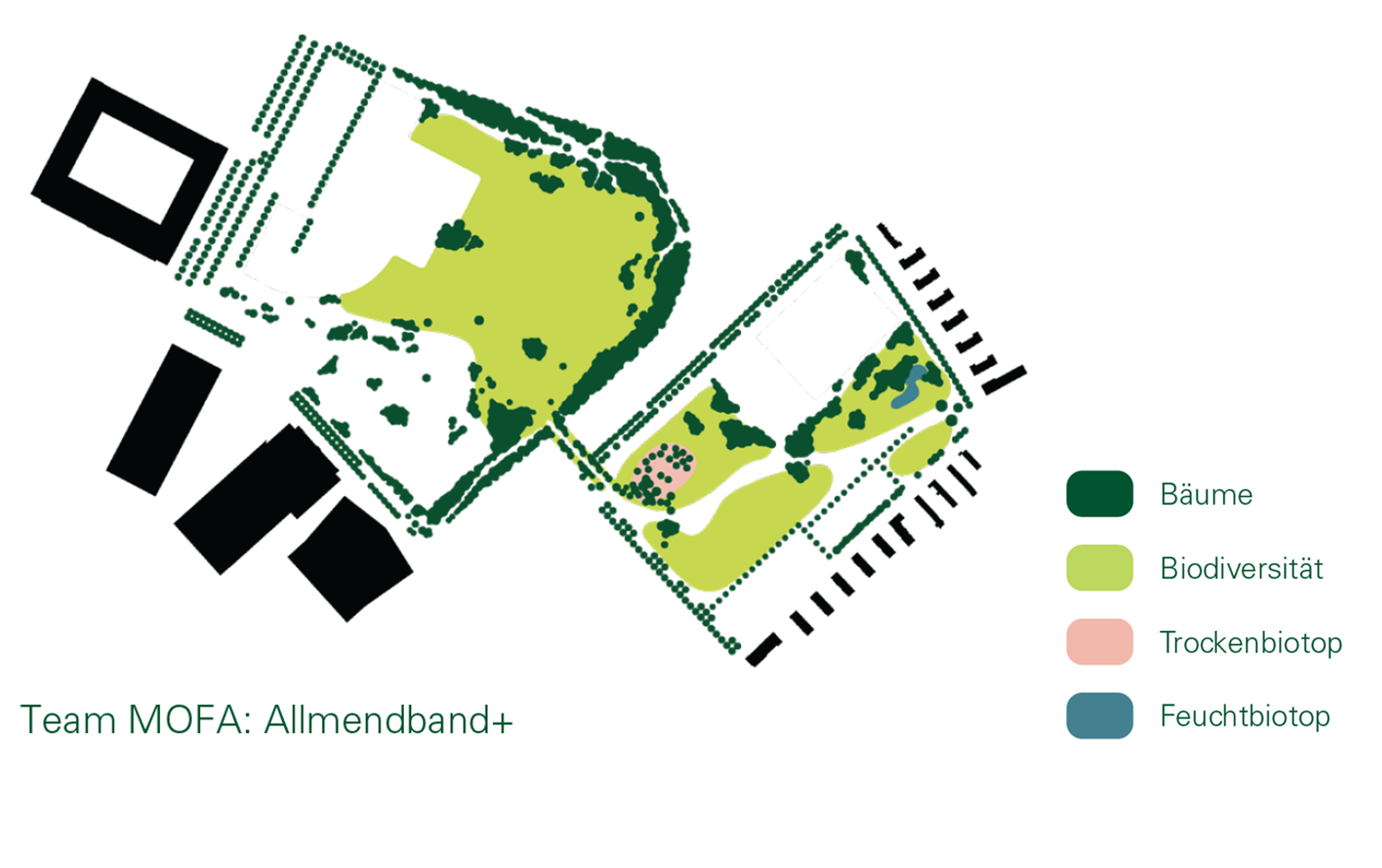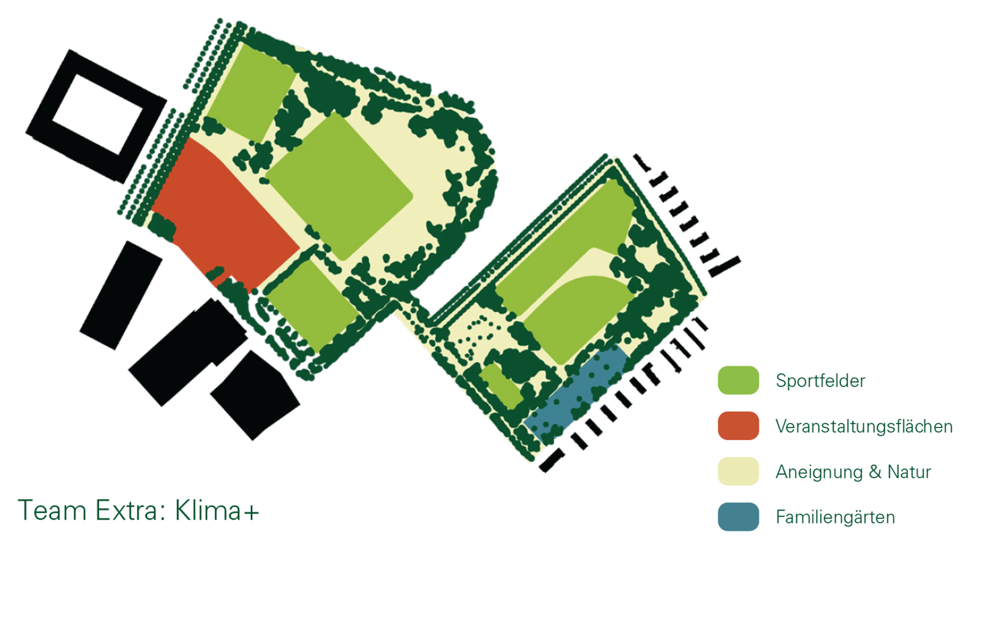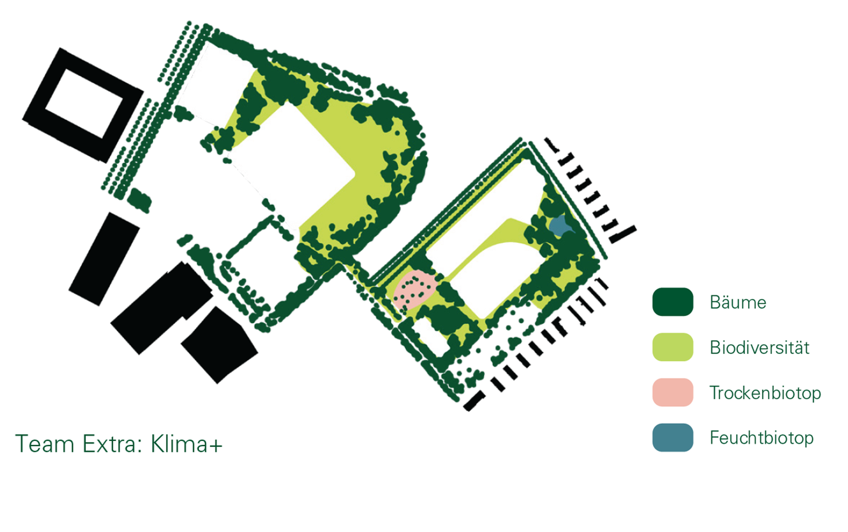 Die Variante «Klima+» von Team Extra stellt ein Maximalszenario dar, um die Allmenden an die stadtklimatischen Herausforderungen anzupassen.