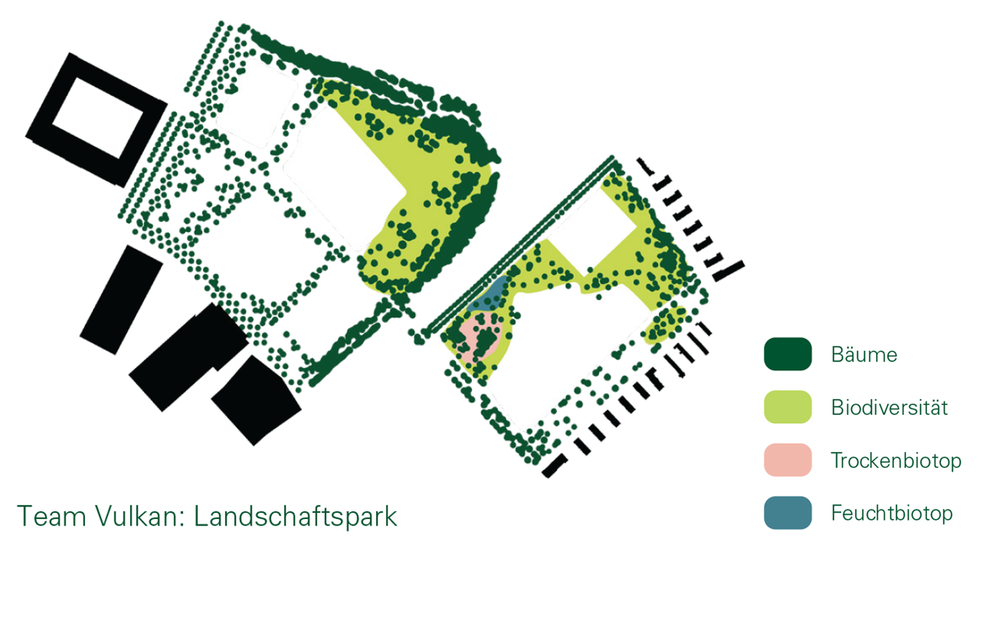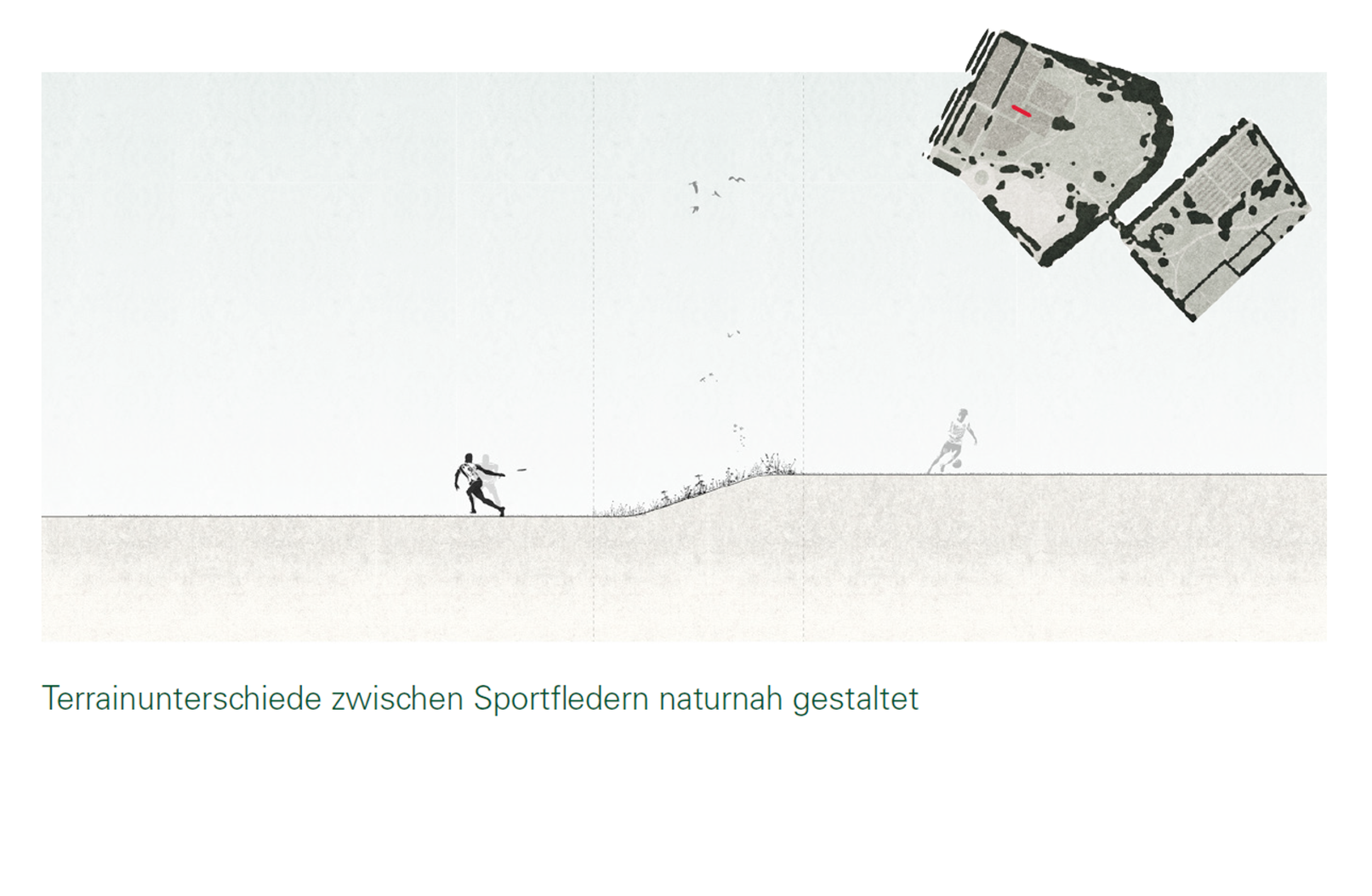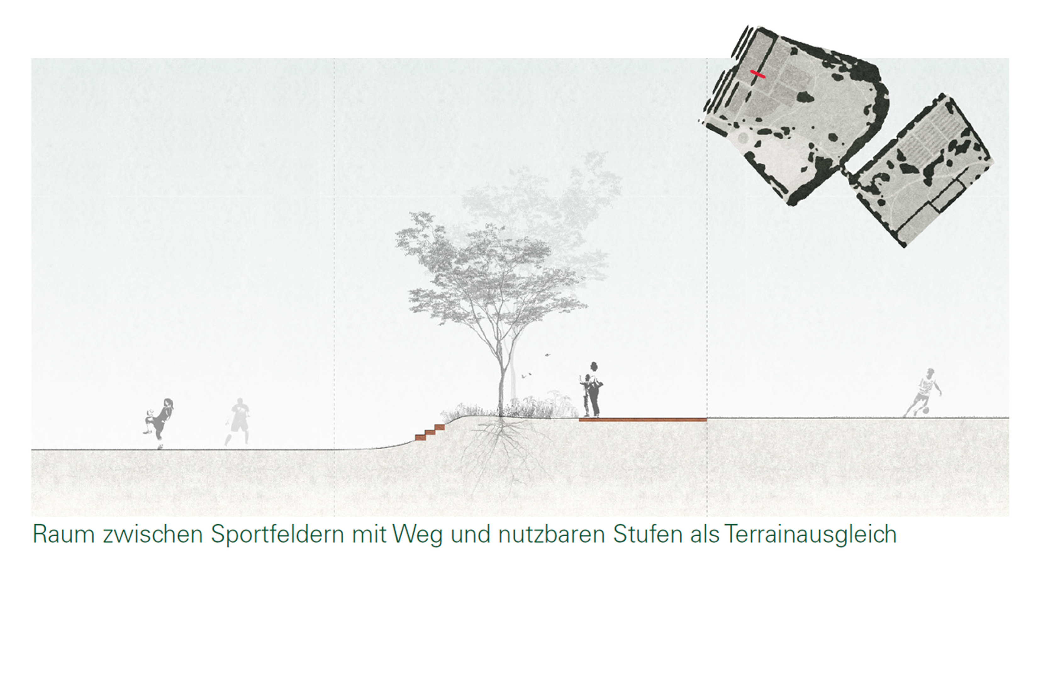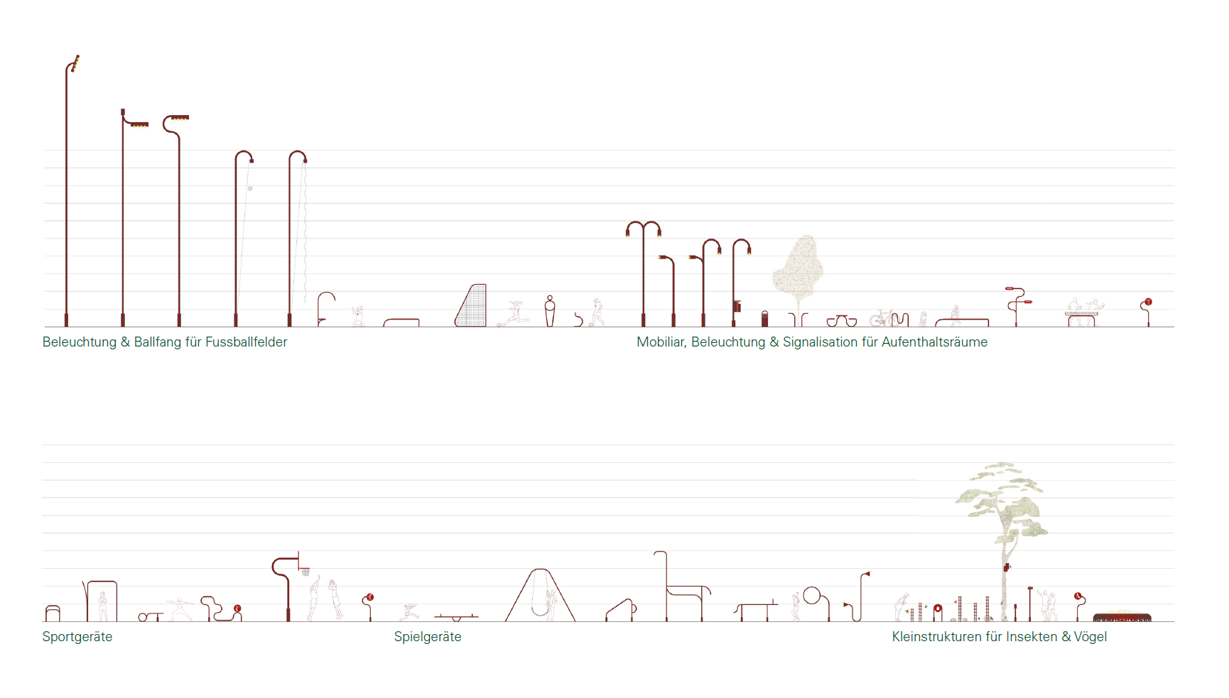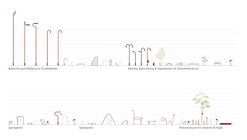 Weiter sind Einrichtung und Möblierung gefragt: Die meisten Nutzungen benötigen Einrichtungen wie Sitzgelegenheiten, Spiel- und Sportgeräte, Wegweiser und Beleuchtungen. Sorgfältig gewählte Elemente können dazu beitragen, einen Ort für Aufenthalt und Nutzung zu aktivieren. Der Beitrag von Team MOFA zeigt in einer einfachen Bildsprache ein breites Spektrum an möglichen Elementen auf.