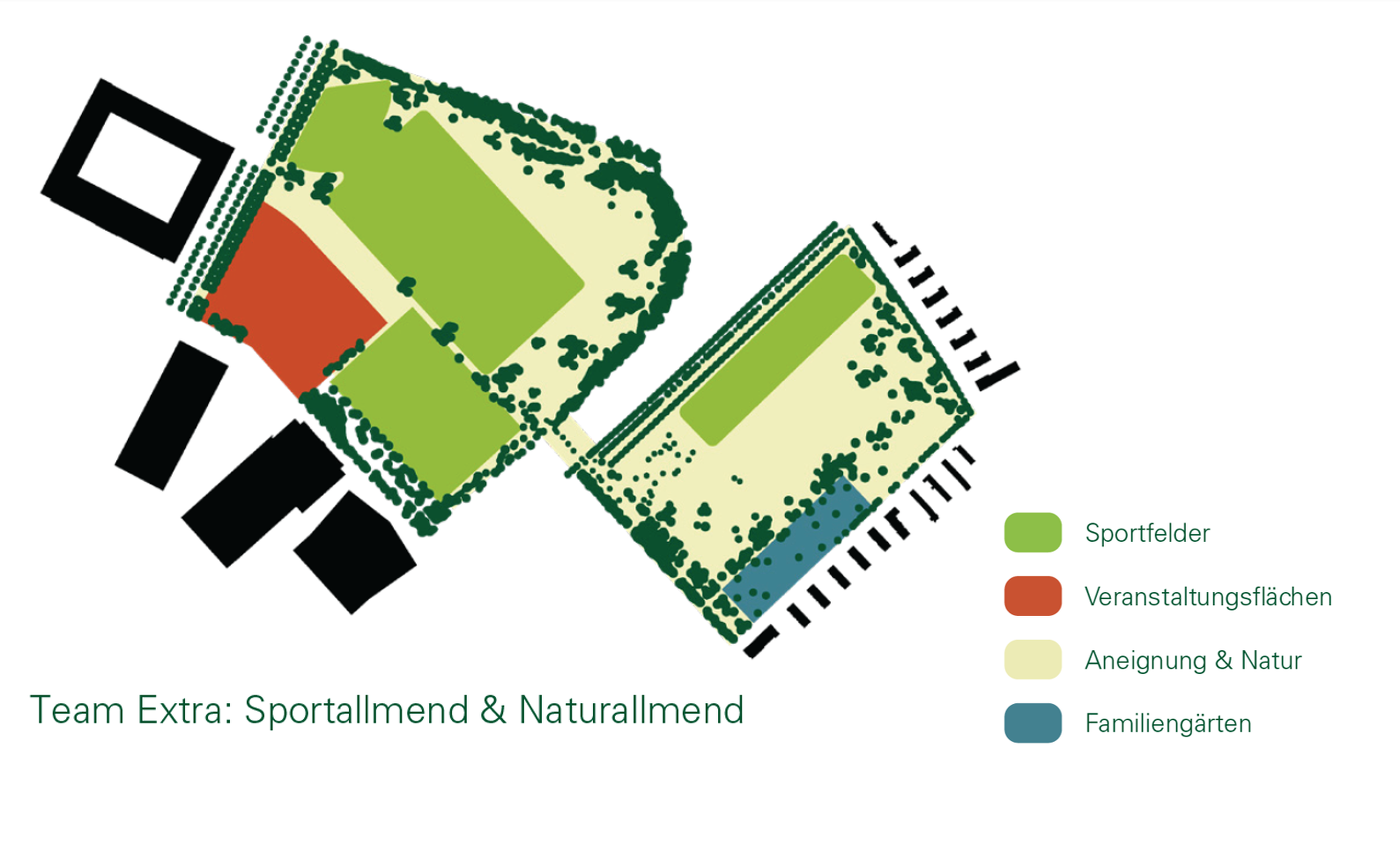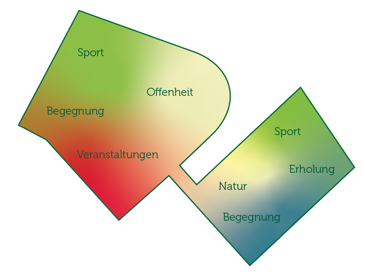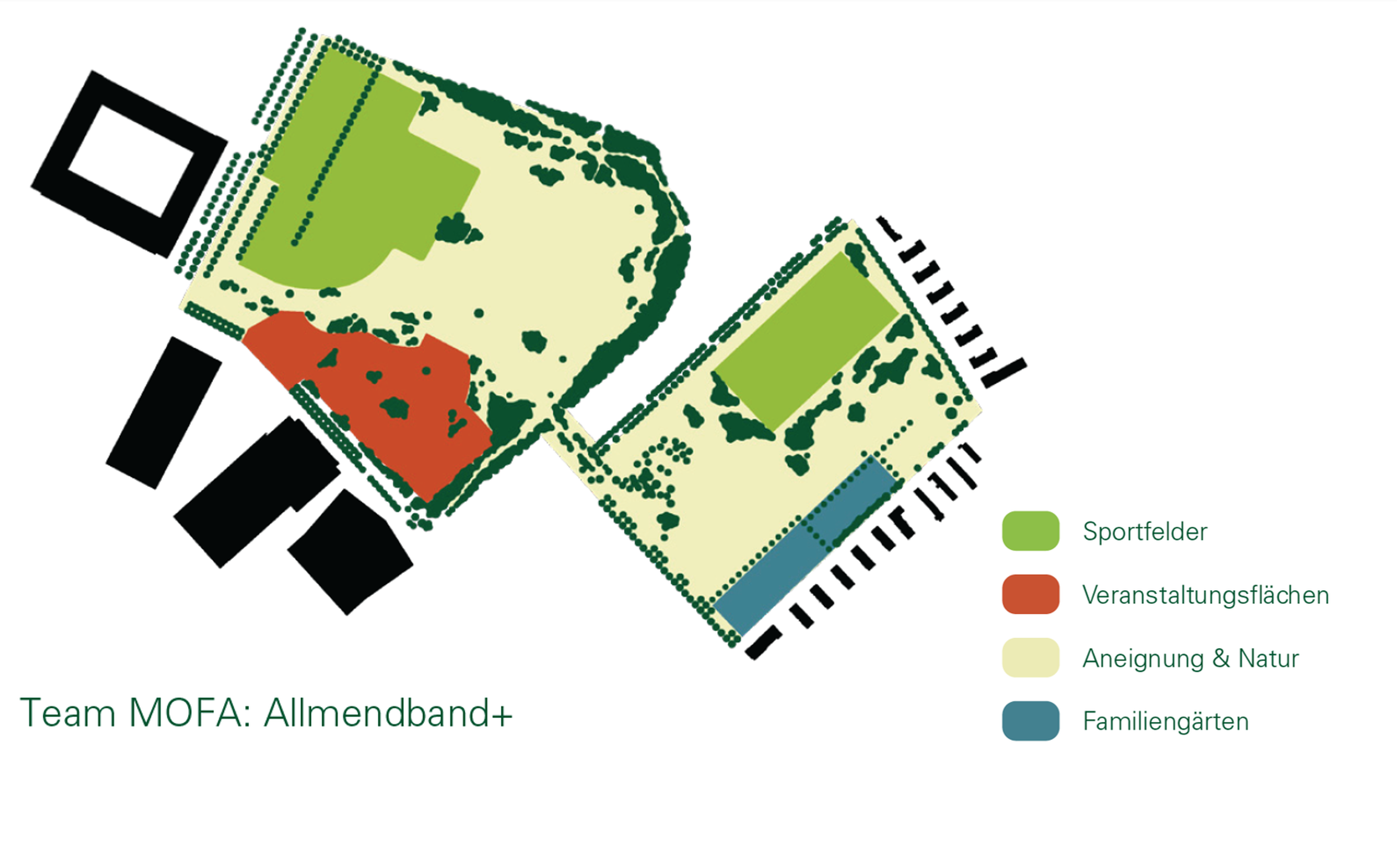 - Das Wesen der Allmenden wird deutlich durch die Anordnung und Intensität der einzelnen Nutzungen geprägt, wie die Varianten zeigen. Ein massgebender Faktor ist die Sportinfrastruktur: Eine Konzentration auf der Grossen Allmend würde den unterschiedlichen Charakter der Allmenden verstärken; eine Verteilung auf beide Allmenden dagegen würde die Grosse Allmend entlasten und die Kleine Allmend beleben.