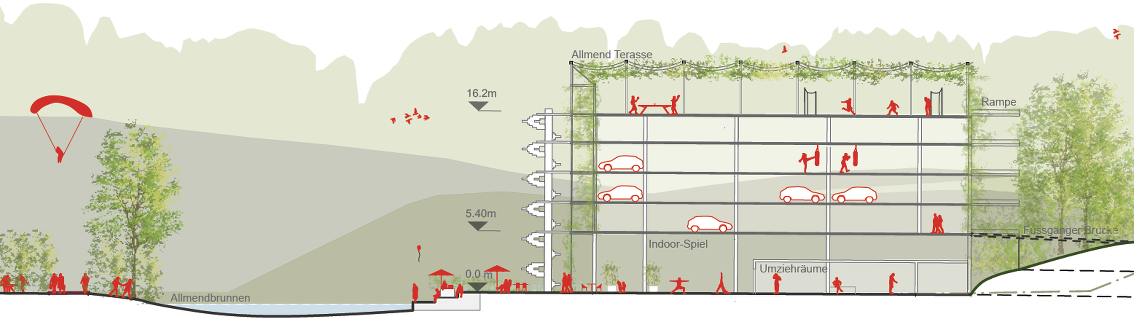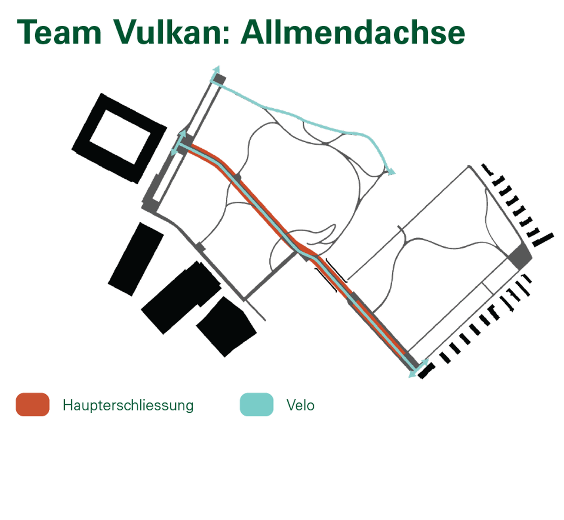 - Bei Team Vulkan übernimmt das «Allmendhaus» die Funktion des sozialen Treffpunkts (siehe Fokusthema Infrastrukturen). Als Alternative wird ein «Allmendpavillon» unmittelbar angrenzend an die Tschäppätstrasse vorgeschlagen.