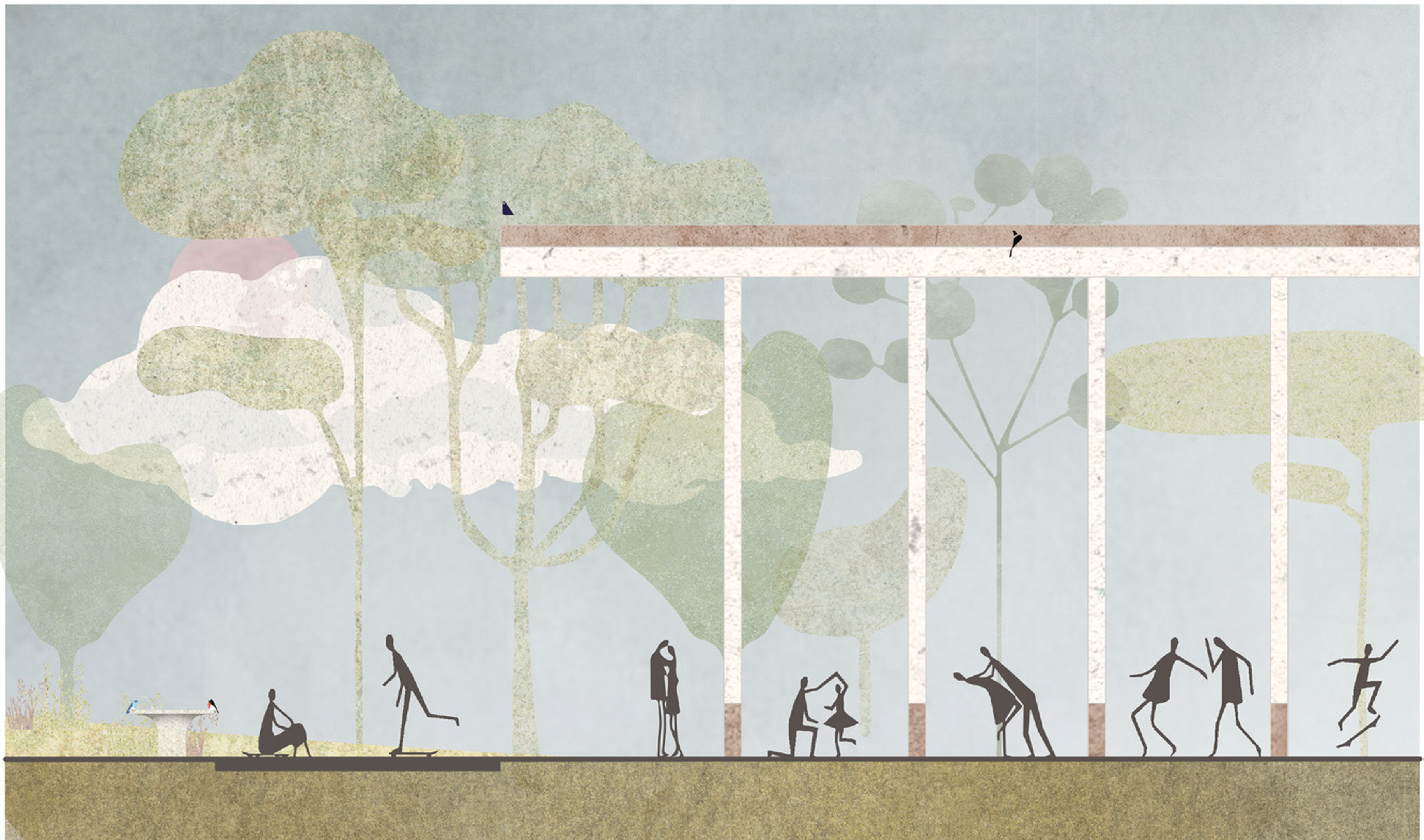 - Team MOFA platziert einen nutzungsoffenen Pavillon zentral am Allmendband. Der Pavillon ist frei zugänglich, kann aber bei Events als Veranstaltungsfläche genutzt werden.