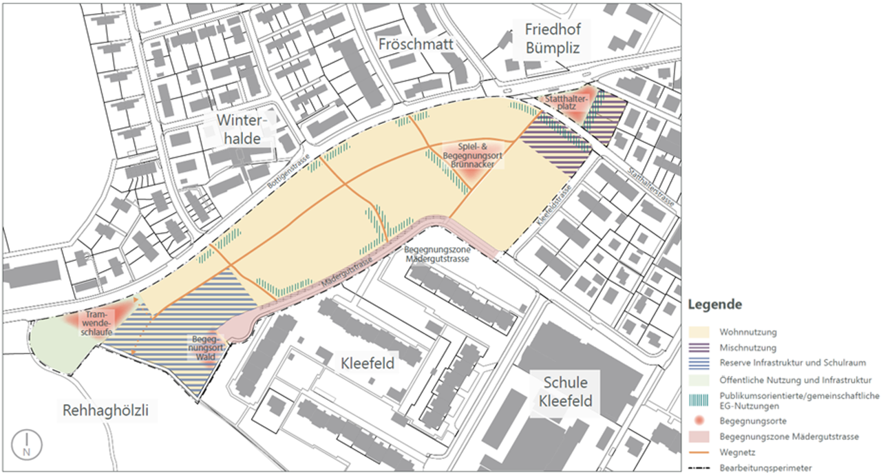 Der Statthalterplatz soll mithilfe solcher Nutzungen als quartiersübergreifender Begegnungsort etabliert werden. Auch entlang der Bottigenstrasse sollen die entsprechenden Voraussetzungen geschaffen werden. Die Mädergutstrasse soll durch verschiedene Nutzungen entlang der Vorplätze gestärkt werden: vorstellbar sind nebst quartierdienlichen Angeboten auch gemeinschaftliche Räume der Bewohnenden (z.B. Gemeinschaftsraum, Waschküche, Veloraum).