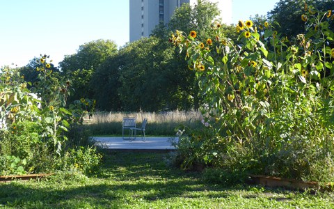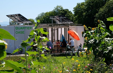Vis-à-vis können prächtige Blumeninseln bestaunt werden, die zusammen mit einem plattformartigen Freiluftzimmer angelegt sind. Die Blumen können nicht nur bestaunt, sondern auch gepflückt werden. Die Rede ist von einer Initiative der Institution Drahtesel und des Vereins Q3012. Das sympathische Arrangement wurde von Freiwilligen und vom Drahtesel gemeinsam mit erwerbslosen Menschen angelegt und gepflegt. Der Holzboden des Freiluftzimmers steht allen Interessierten offen, die eine Idee wie kürzlich das «Pick-Nick im Freiluftzimmer» verwirklichen wollen.