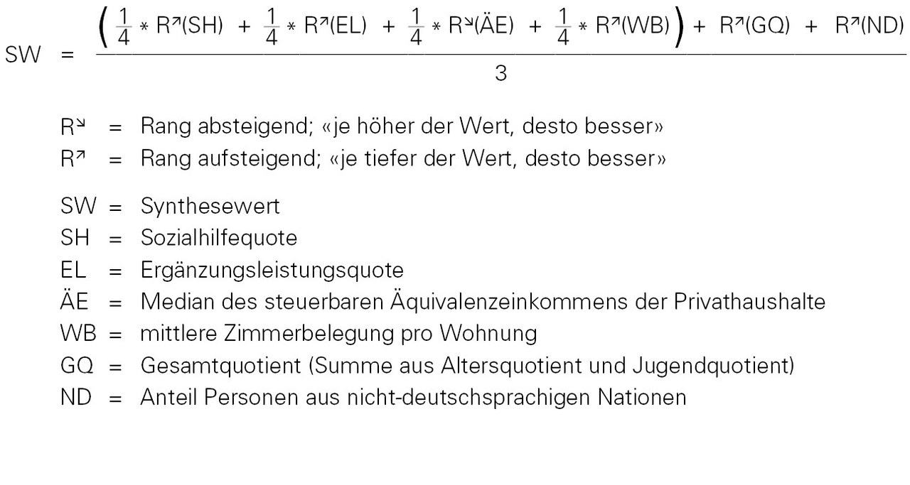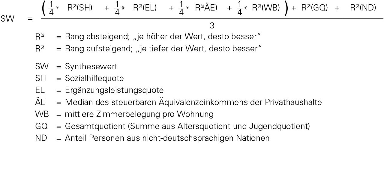 Die Variablen werden über alle Wohngebiete (entweder Gebräuchliche Quartiere, Statistische Bezirke oder Stadtteile) rangiert (absteigend: Median des steuerbaren Äquivalenzeinkommens der Privathaushalte; aufsteigend: Sozialhilfequote, Ergänzungsleistungsquote, mittlere Zimmerbelegung pro Wohnung, Gesamtquotient und Anteil ausländischer Personen aus nicht-deutschsprachigen Nationen). Wenn ein Themenblock mehr als eine Variable beinhaltet, werden diese entsprechend gewichtet und zusammengefasst. Anschliessend wird der Mittelwert aus den einzelnen Rängen pro Wohngebiete ermittelt, wobei ein tieferer resultierender Rang, eine tiefere soziale Belastung bedeutet. Aufgrund dieses gemittelten Rangs werden die Wohngebiete anschliessend in fünf Quintile eingeteilt, welche die fünf Synthesewerte (2, 1, 0, –1, –2) auf der Synthesekarte darstellen, wobei ein negativer Synthesewert für eine höhere soziale Belastung des Wohngebiets und ein positiver Wert für ein sozial begünstigtes Wohngebiet steht.