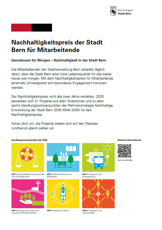 Der Nachhaltigkeitspreis für Mitarbeitende soll die Bandbreite an Projekten in der Stadtverwaltung aufzeigen, die zu einer nachhaltigen und lebenswerten Stadt beitragen. 2025 haben 21 Projekte aus allen Direktionen bei der Ausschreibung mitgemacht.