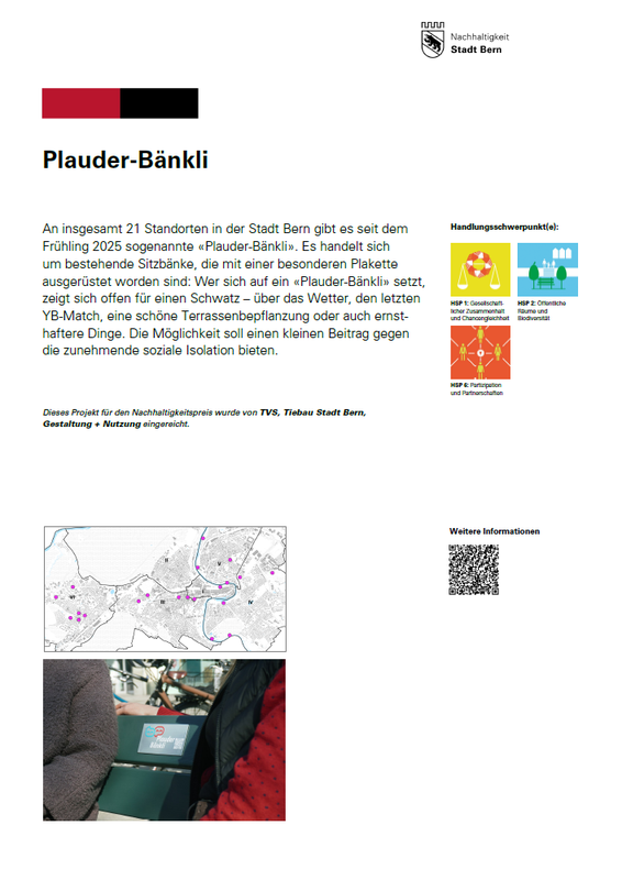 Im September 2025 wurde der Nachhaltigkeitspreis für Mitarbeitende der Stadtverwaltung vergeben. Das Thema der Nachhaltigkeit war dabei breit gefasst und ermöglichte es, ganz unterschiedliche Projekte einzugeben. Es sind insgesamt 21 Projekte aus allen Direktionen und allen Handlungsschwerpunkten der Rahmenstrategie Nachhaltige Entwicklung (RAN2030) eingereicht worden. Die eingereichten Projekte wurden von einer Jury, bestehend aus der Steuerungsgruppe der Rahmenstrategie Nachhaltige Entwicklung, beurteilt. Die Preisverleihung fand am Personalanlass am 3. September 2025 statt.